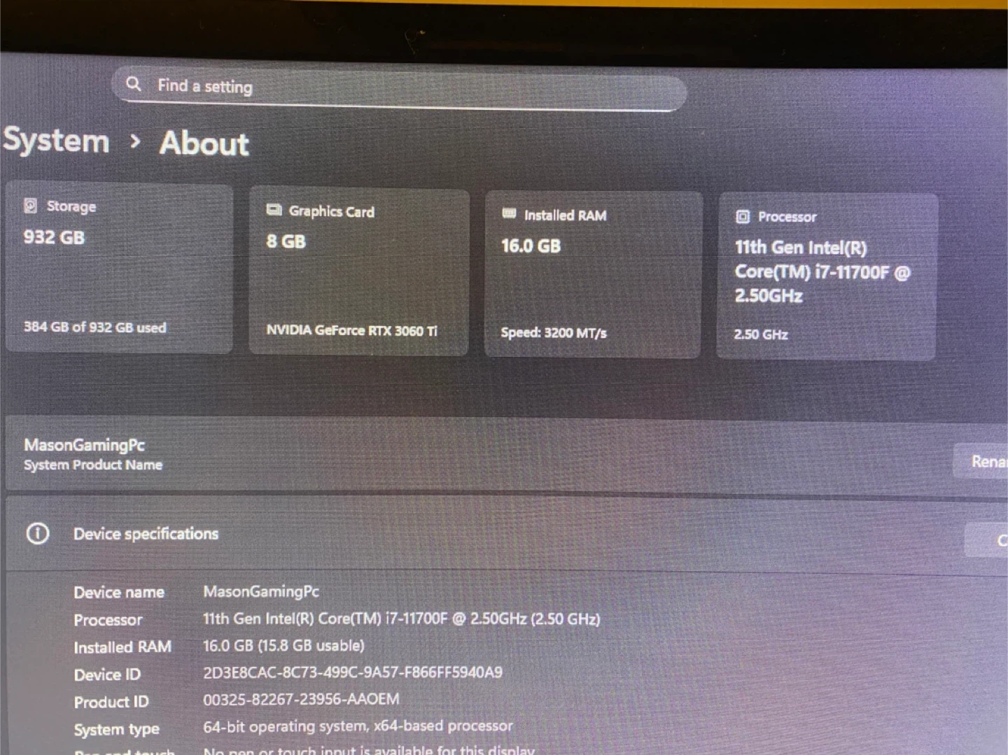 Selling a custom-built gaming PC along with some peripherals! The PC has an 11th Gen Intel(R) Core(TM) i7-11700F processor, 16GB of RAM, and an NVIDIA GeForce RTX 3060 Ti graphics card.