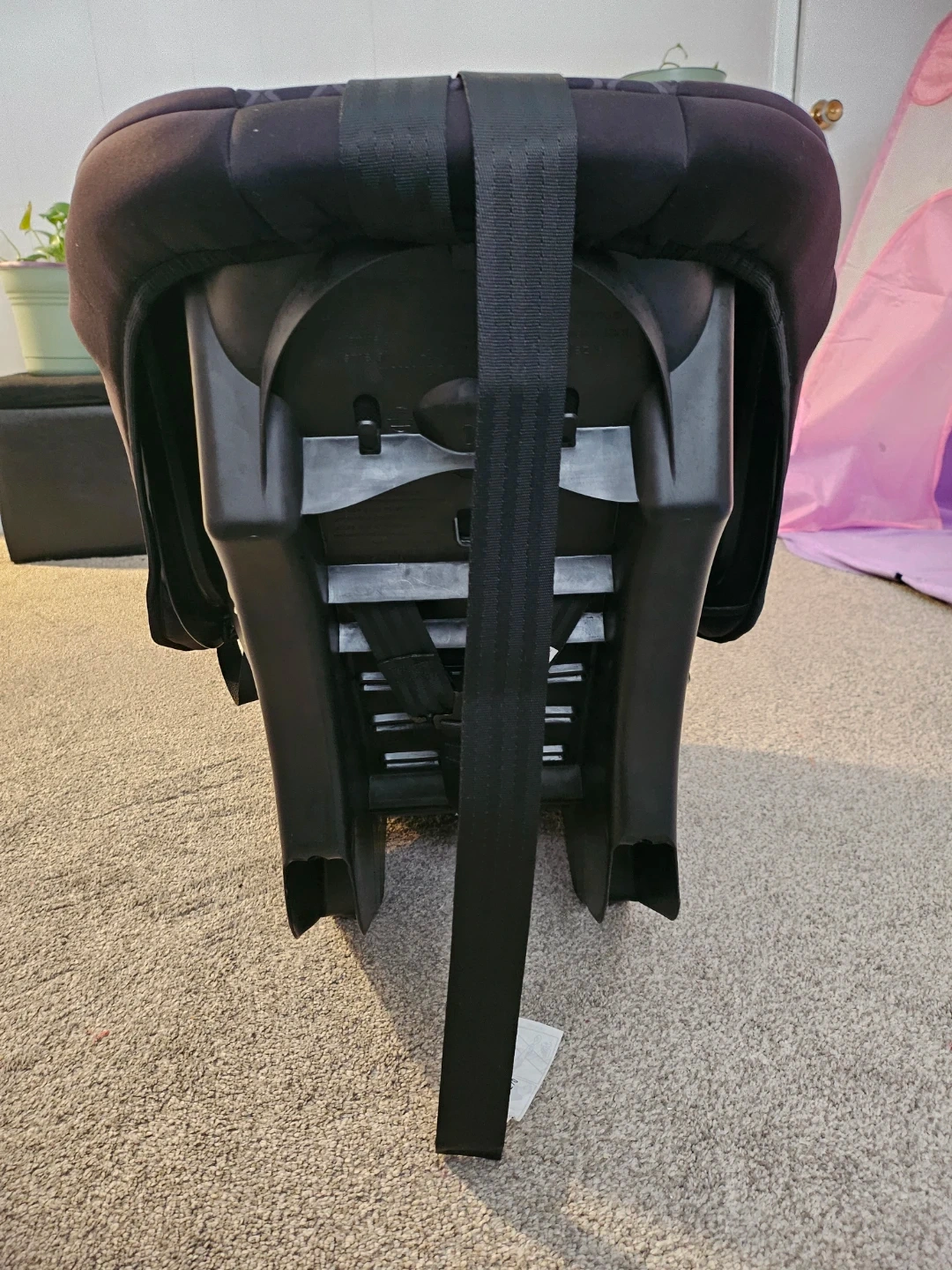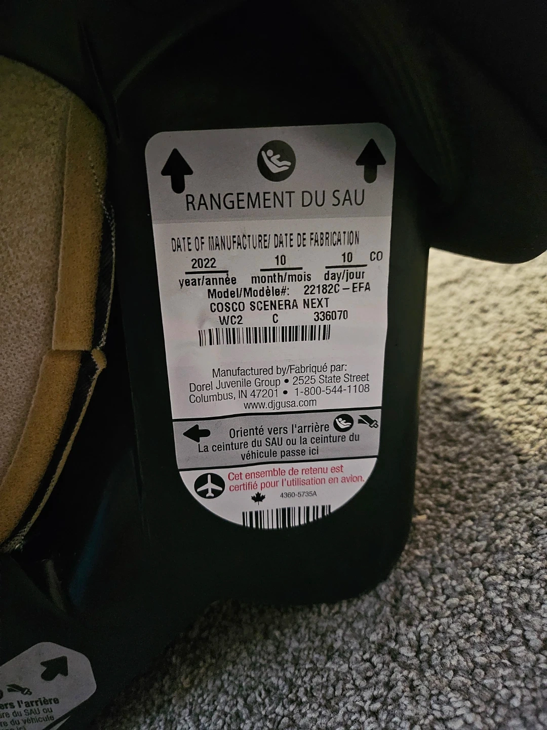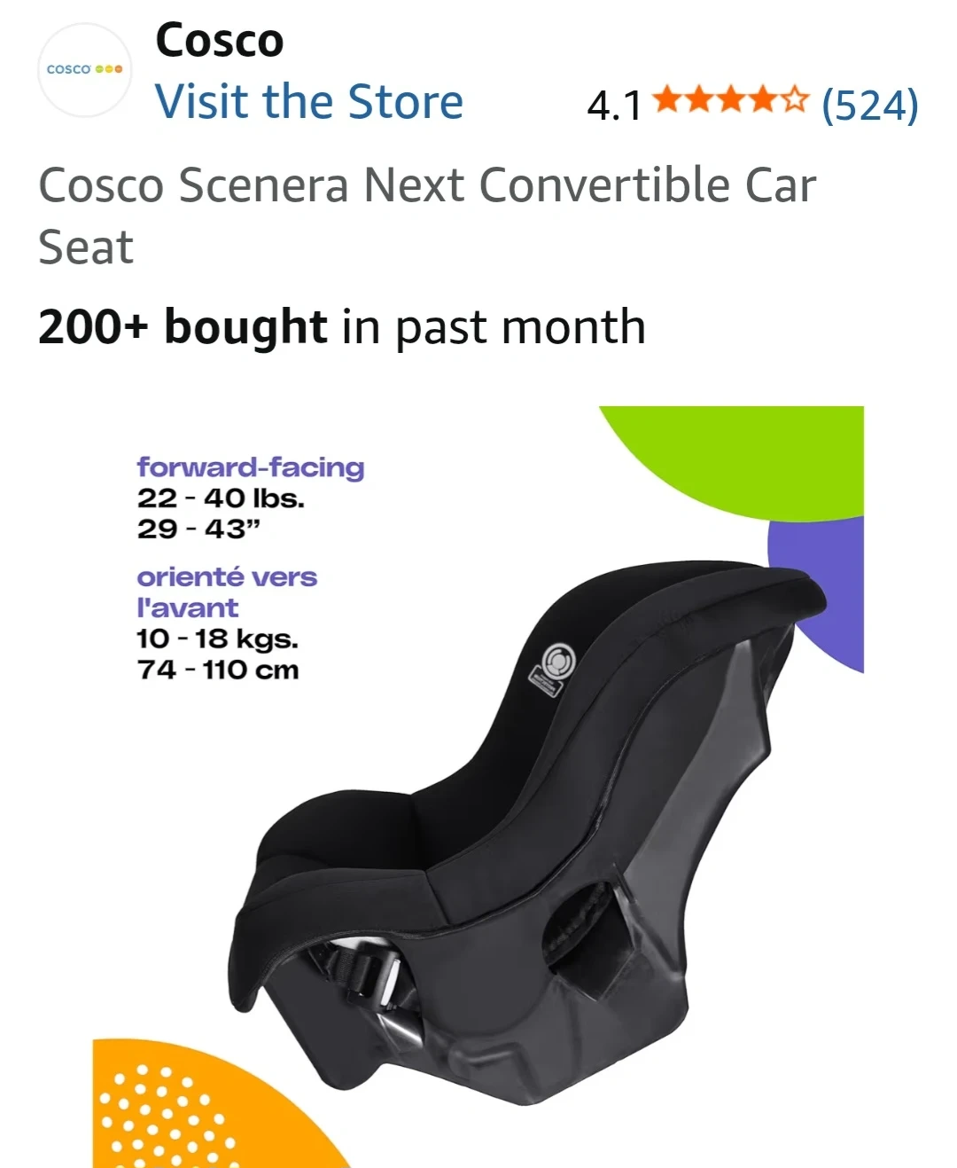 This is a Cosco Scenera Next convertible car seat. It's black and manufactured in October 2022. It's suitable for rear-facing from 5-40 lbs (19-40") and forward-facing from 22-40 lbs (29-43"). Price negotiable.