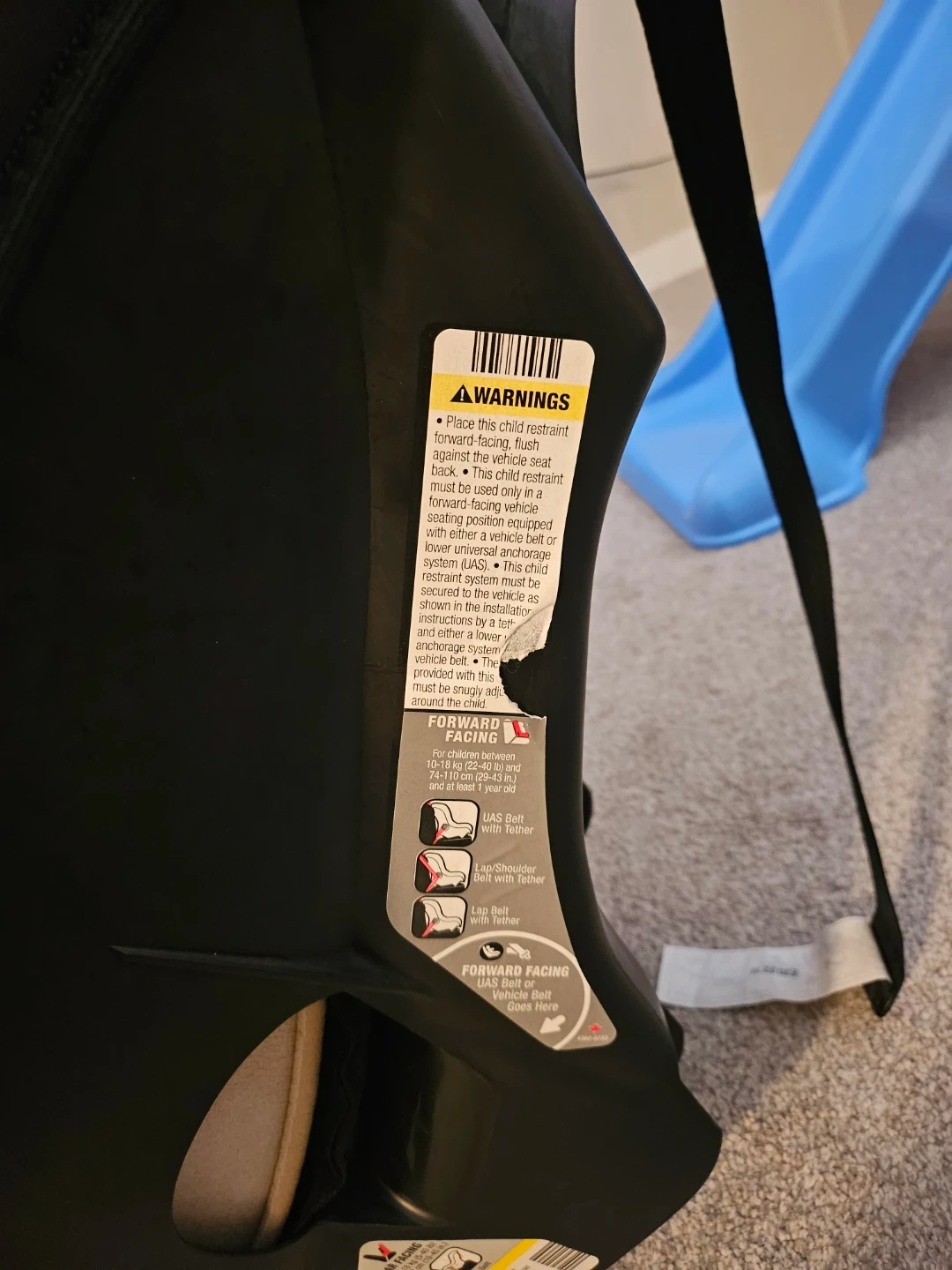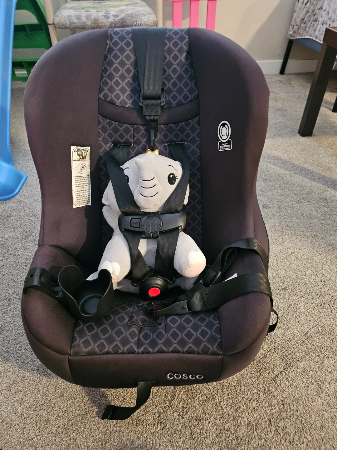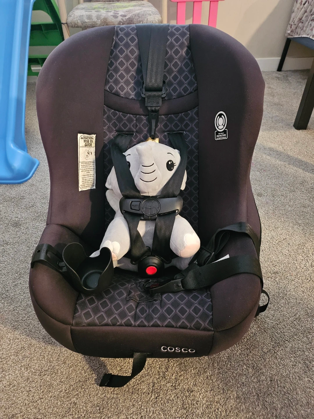 This is a Cosco Scenera Next convertible car seat. It's black and manufactured in October 2022. It's suitable for rear-facing from 5-40 lbs (19-40") and forward-facing from 22-40 lbs (29-43"). Price negotiable.