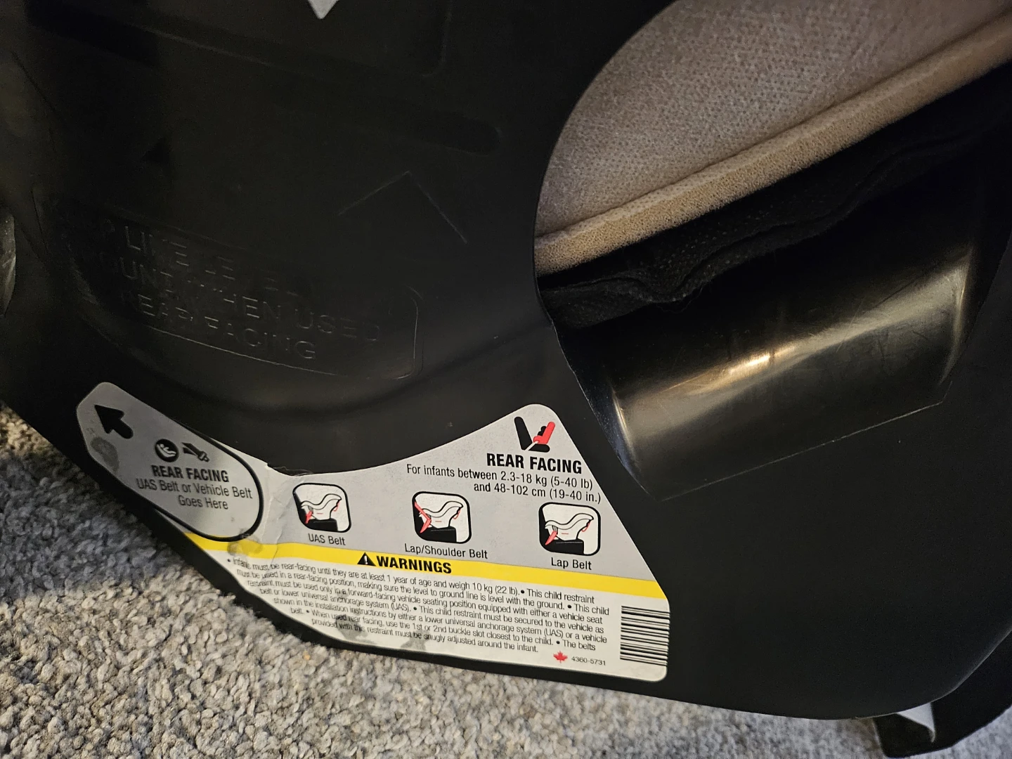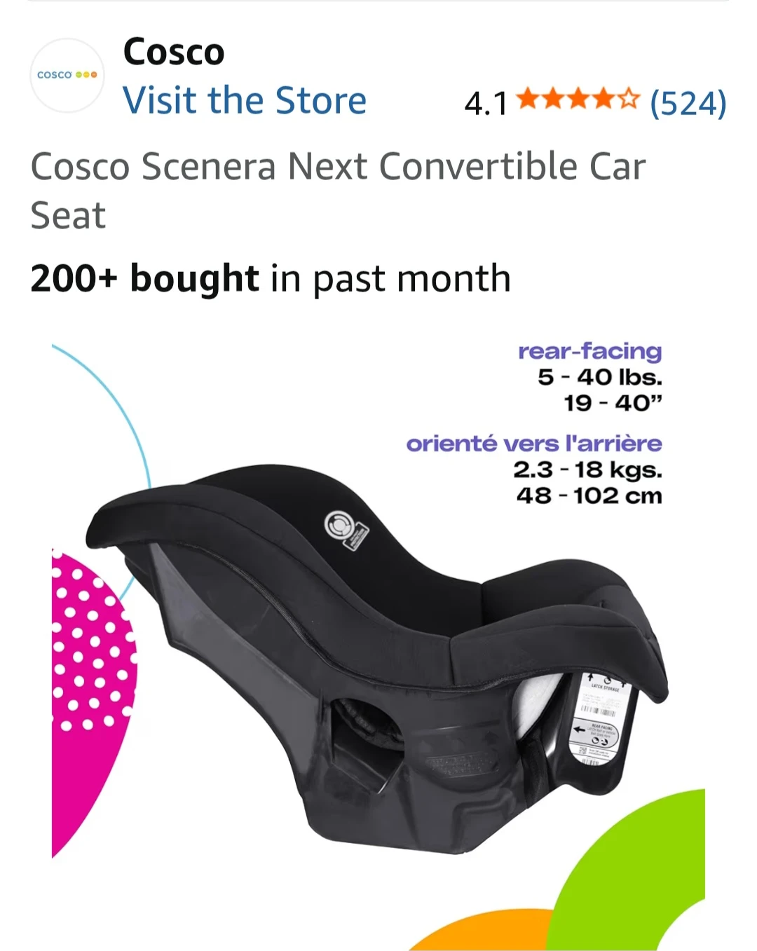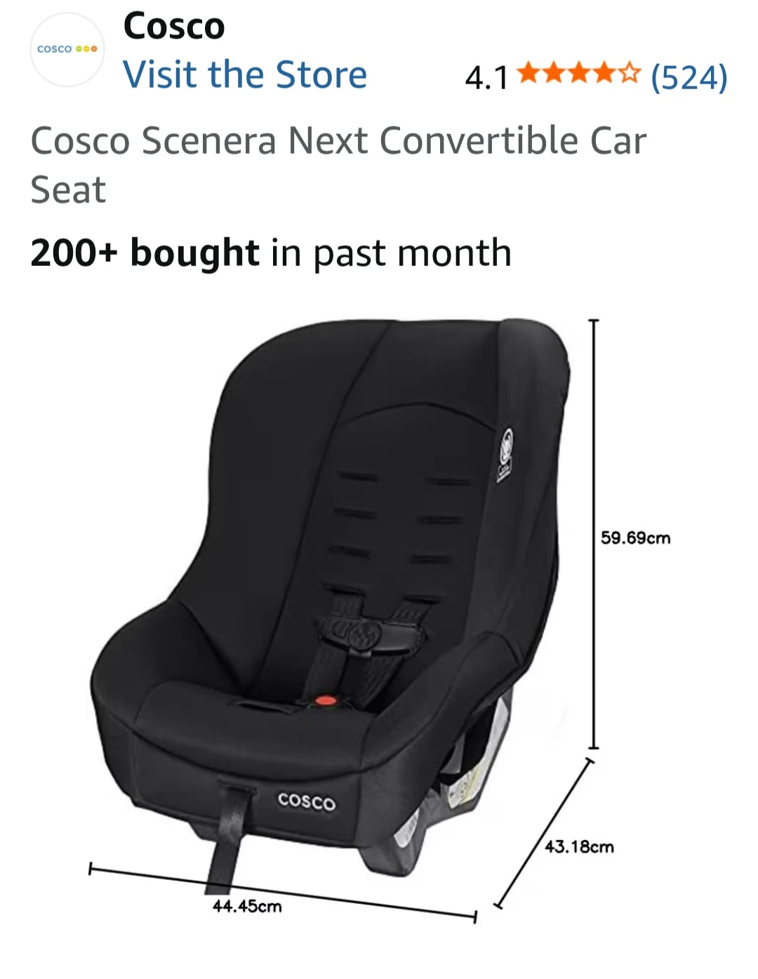 This is a Cosco Scenera Next convertible car seat. It's black and manufactured in October 2022. It's suitable for rear-facing from 5-40 lbs (19-40") and forward-facing from 22-40 lbs (29-43"). Price negotiable.
