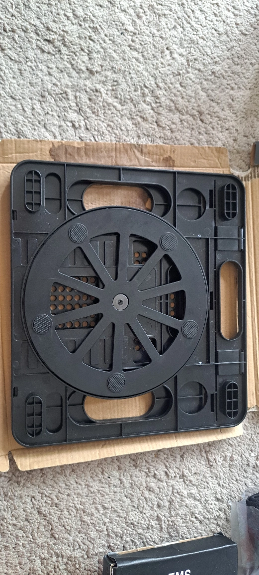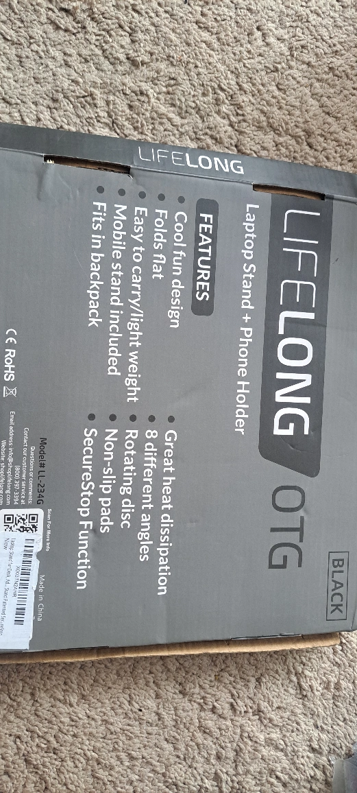 Selling a Lifelong OTG laptop stand and phone holder in black. It folds flat and is easy to carry, making it lightweight and portable. It also features a rotating disc and non-slip pads, and the box is included!