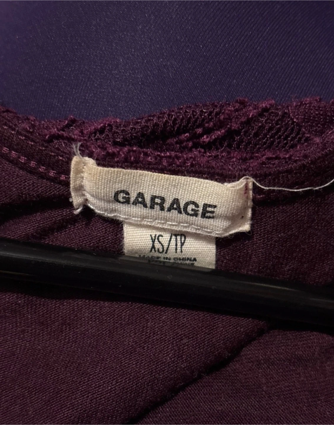 This is a size XS Garage Lace Top. As seen in the photos, it's in good condition. This purple lace top features a flattering scoop neck and 3/4 sleeves, perfect for adding a touch of elegance to any outfit.