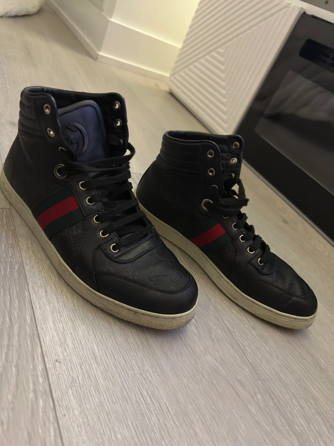 Black leather high-top sneakers from Gucci. Features the signature green and red stripe detail. Embossed Gucci logo pattern throughout.