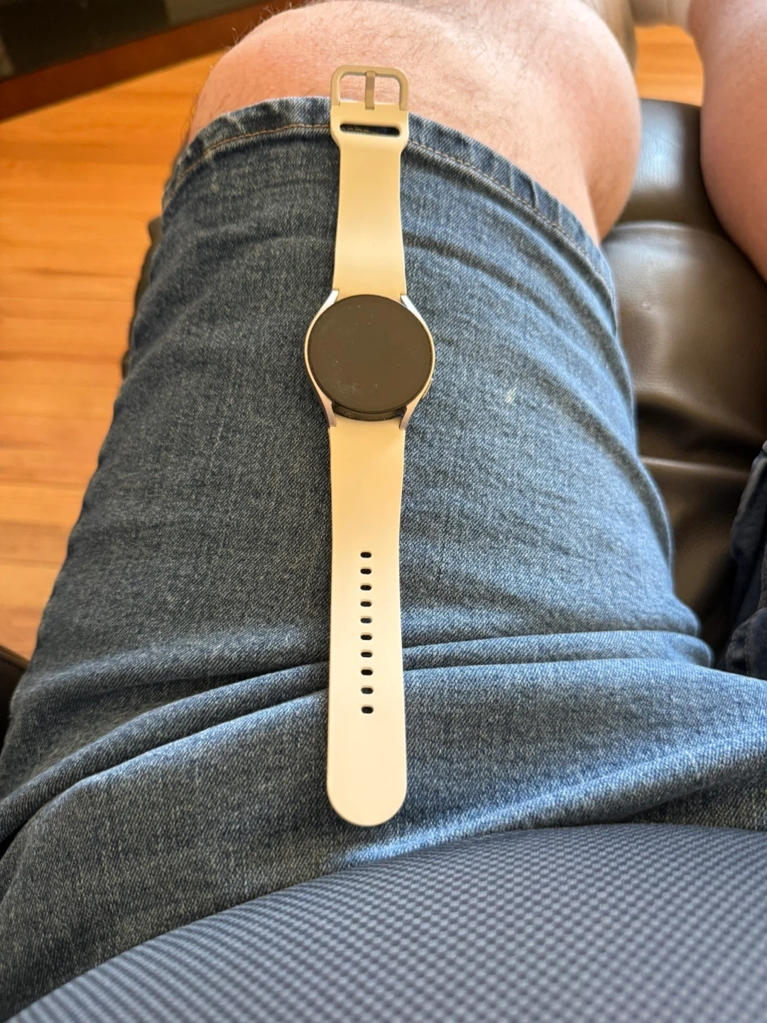 Selling a Samsung Galaxy Watch 4 Classic. It's a smart watch with a beige band. The watch face is black and round.