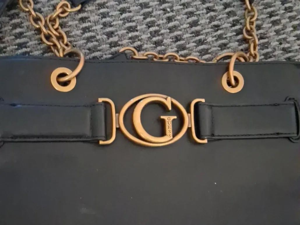 This Guess shoulder bag is black with gold hardware. It features the signature G logo prominently on the front. The chain strap adds a stylish touch.