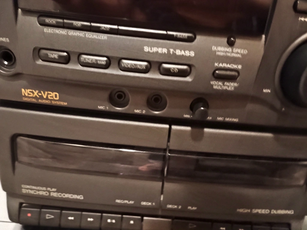 Selling an Aiwa NSX-V20 digital audio system. It features a CD player, tape deck, and electronic graphic equalizer. It also has a Super T-Bass function and karaoke capability. Great for anyone looking for a vintage audio system! Needs some work on both the decks and cd reader. Comes with the original remote in excellent condition but NO SPEAKERS.