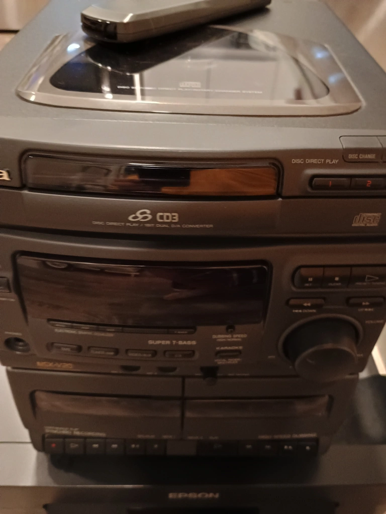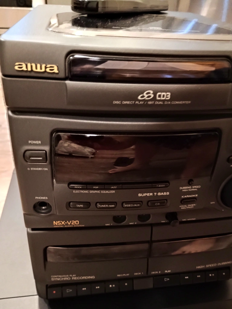 Selling an Aiwa NSX-V20 digital audio system. It features a CD player, tape deck, and electronic graphic equalizer. It also has a Super T-Bass function and karaoke capability. Great for anyone looking for a vintage audio system! Needs some work on both the decks and cd reader. Comes with the original remote in excellent condition but NO SPEAKERS.