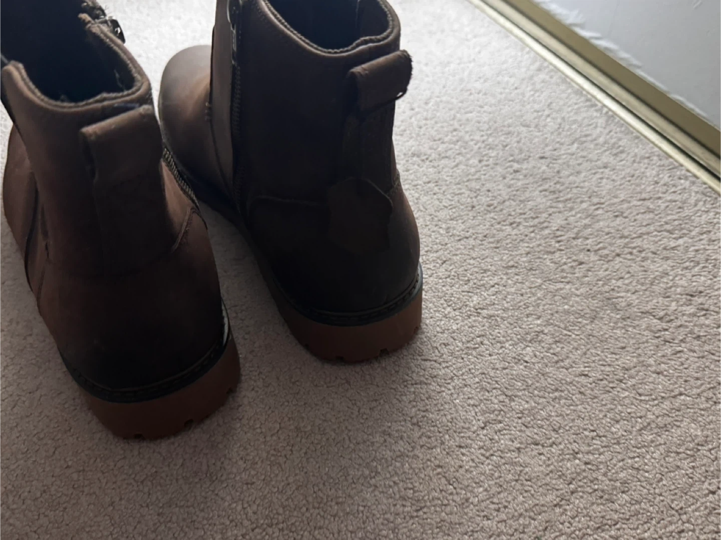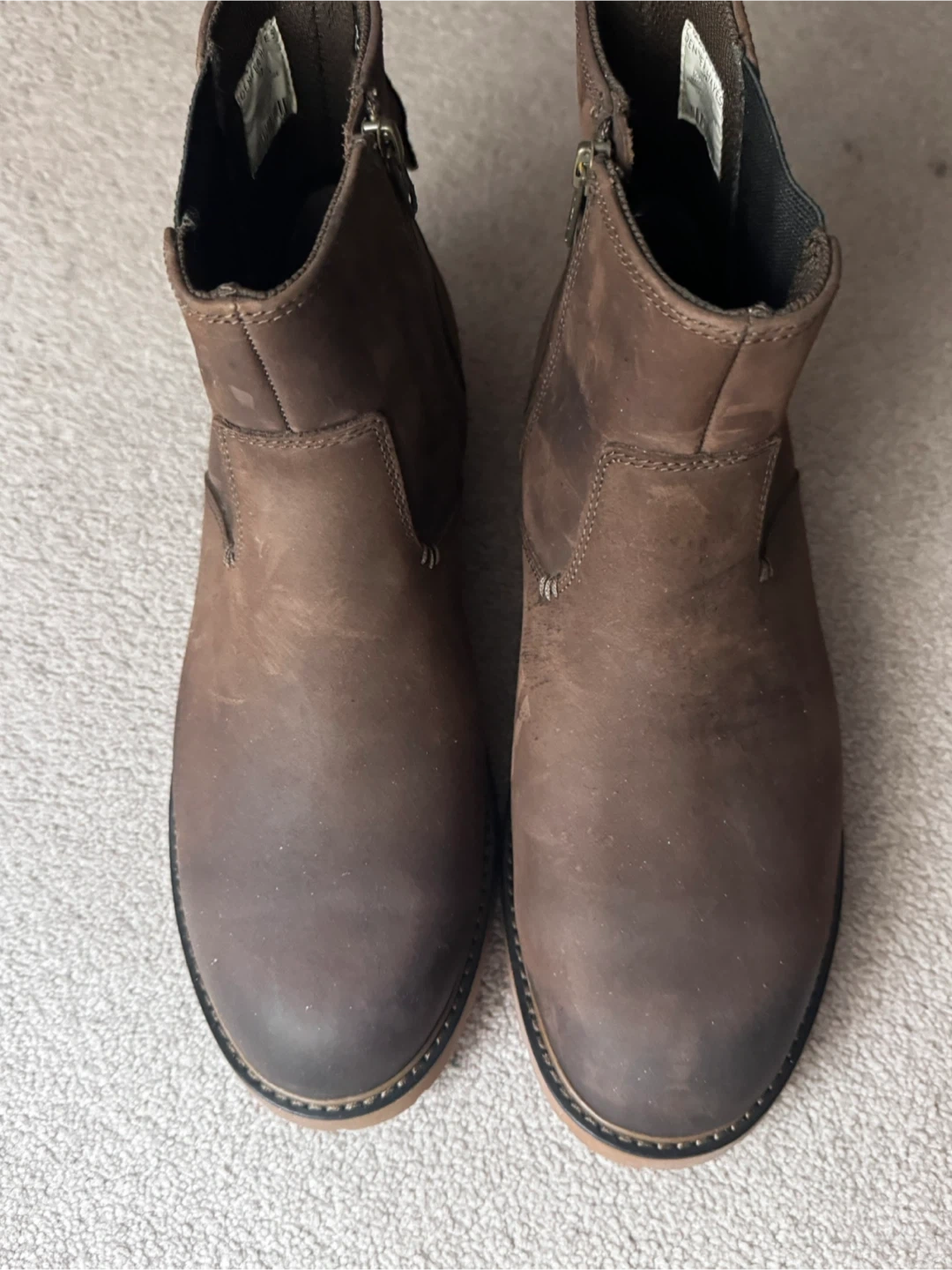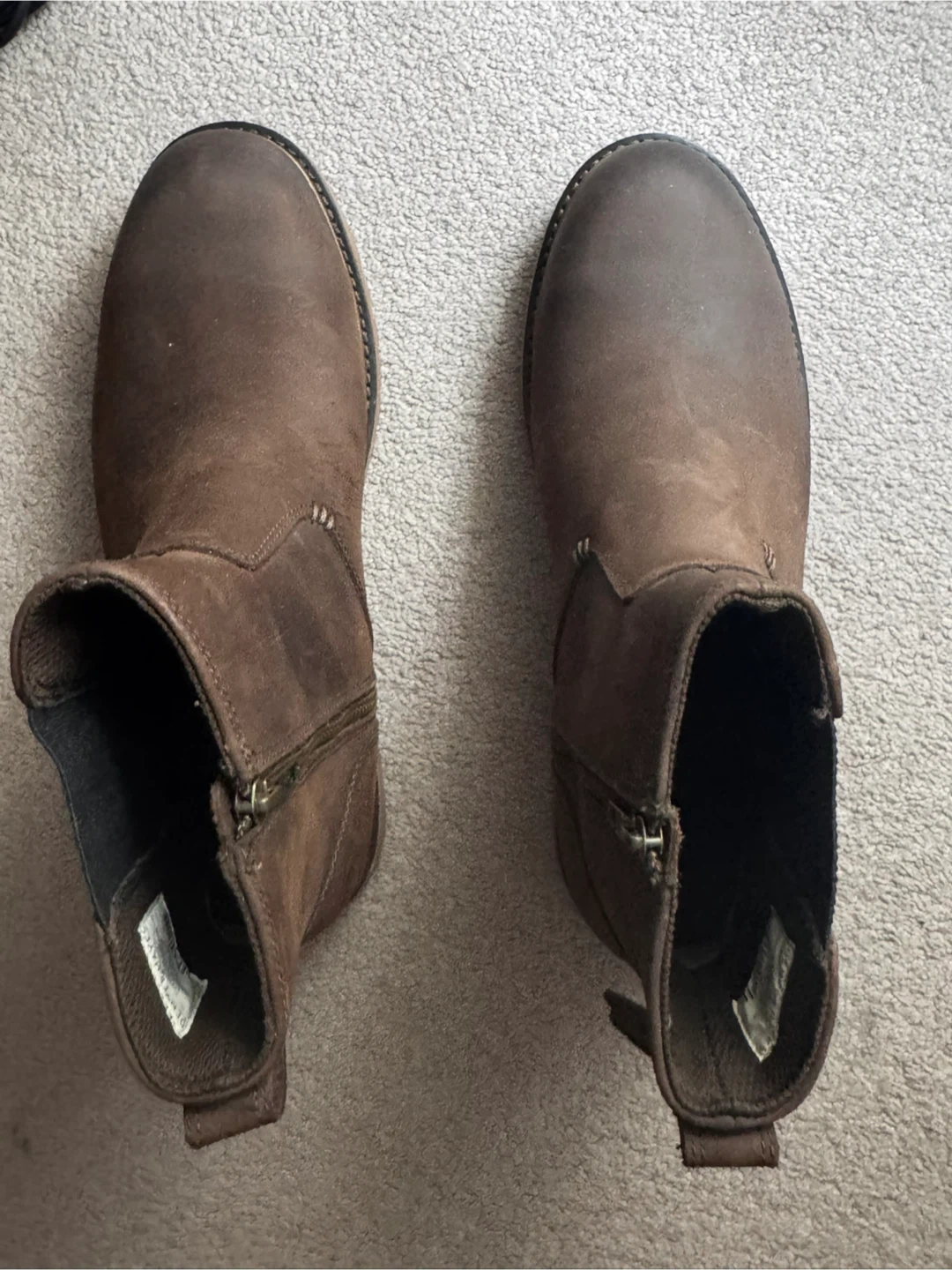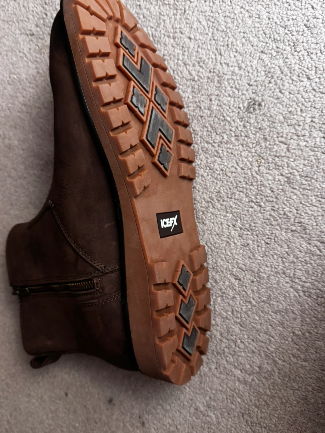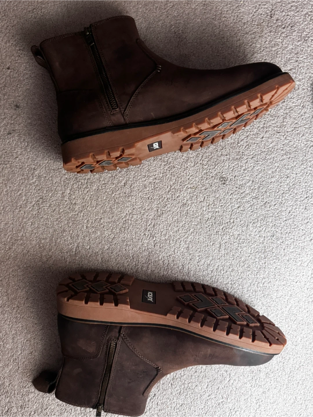 Brown suede winter boots with a side zipper closure. Features a durable lug sole for traction. These boots are great for cold weather.