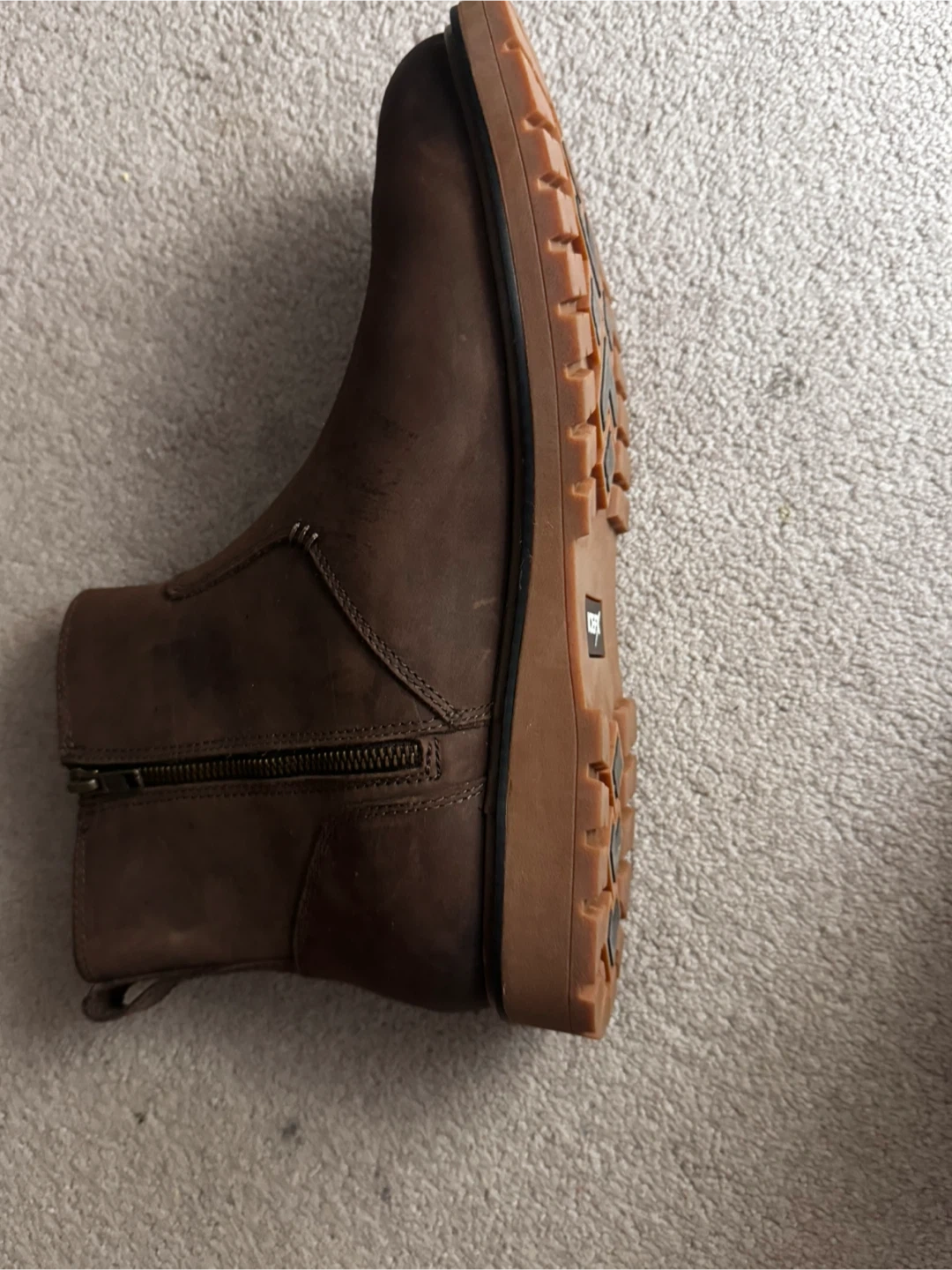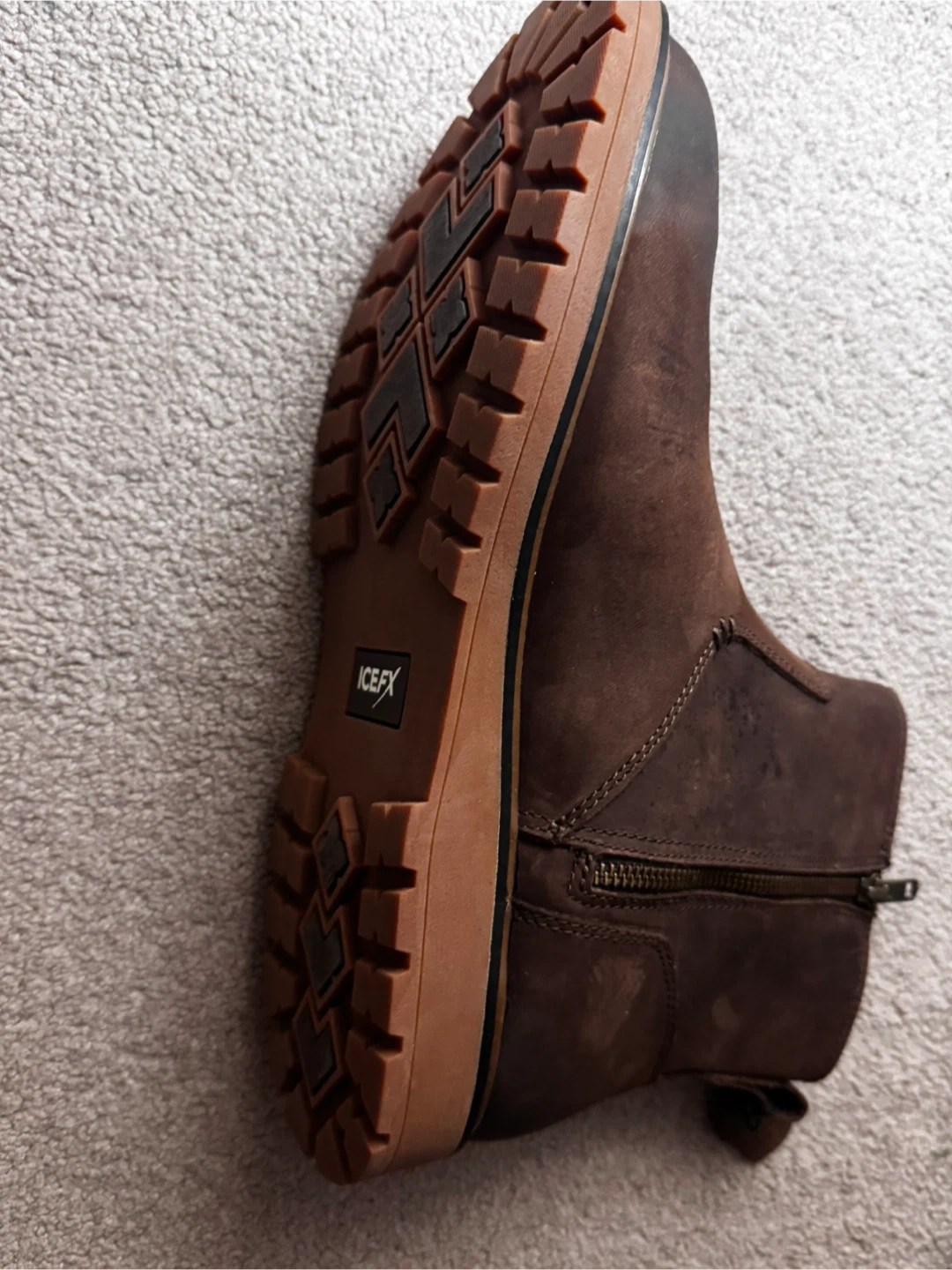 Brown suede winter boots with a side zipper closure. Features a durable lug sole for traction. These boots are great for cold weather.