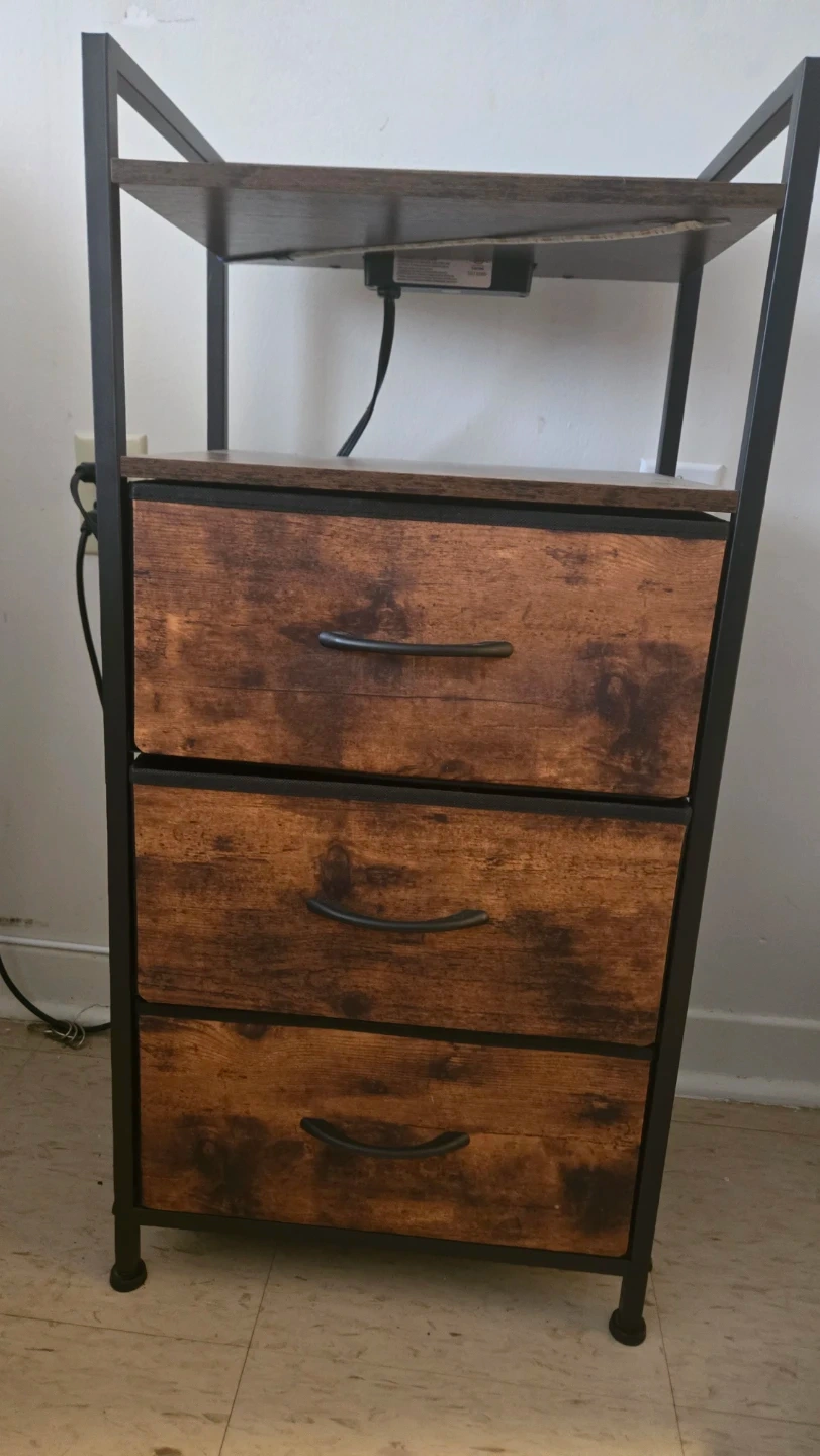This storage unit features three fabric drawers with wood-look fronts and a metal frame. It's equipped with a power strip that includes two outlets and a USB port. The top shelf has integrated LED lights that are controlled by a remote. It's a handy piece for organizing essentials. Need gone I don't have the space for it message me if you interested about it PICK UP ONLY