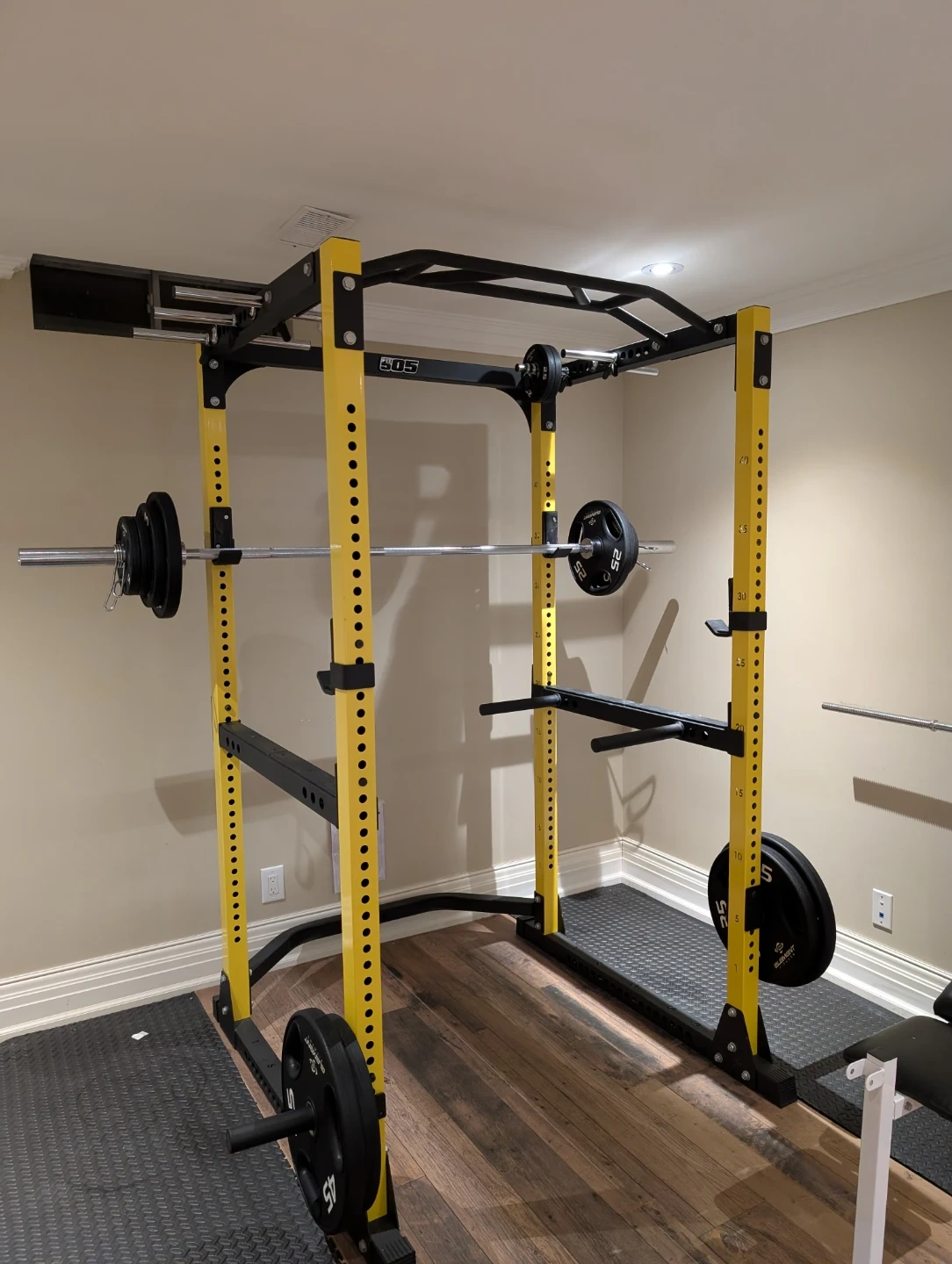 This is a FIT 505 power rack in yellow and black. The barbell and weights are sold separately.