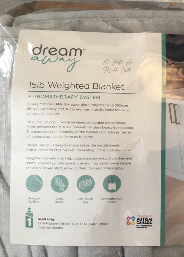 Brand new Dream Away 15lb weighted blanket with aromatherapy system. Designed for comfort and relaxation, it's made from soft milk-silk super plush polyester with 250 gsm filling. Features hexagon quilting for even weight distribution and soft touch ties. Price is $55. If you see this ad, it's still available!