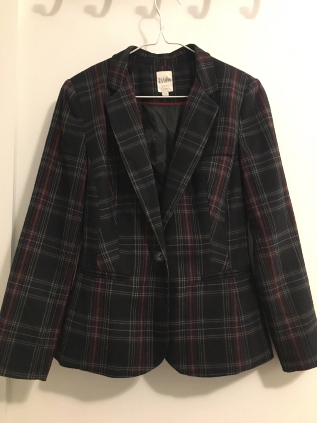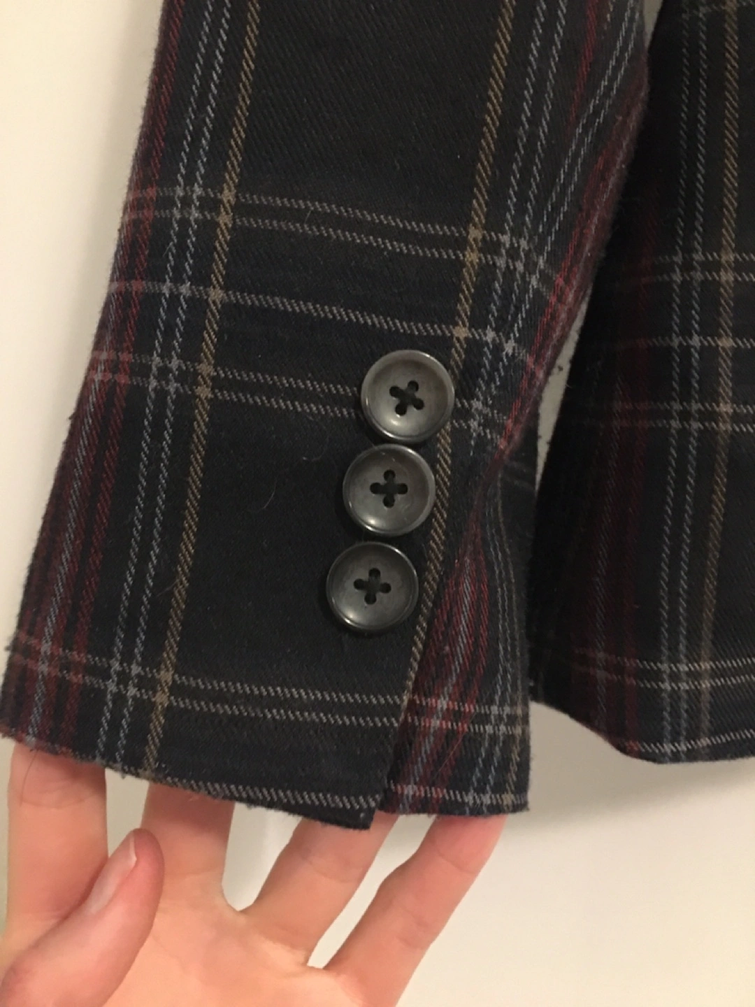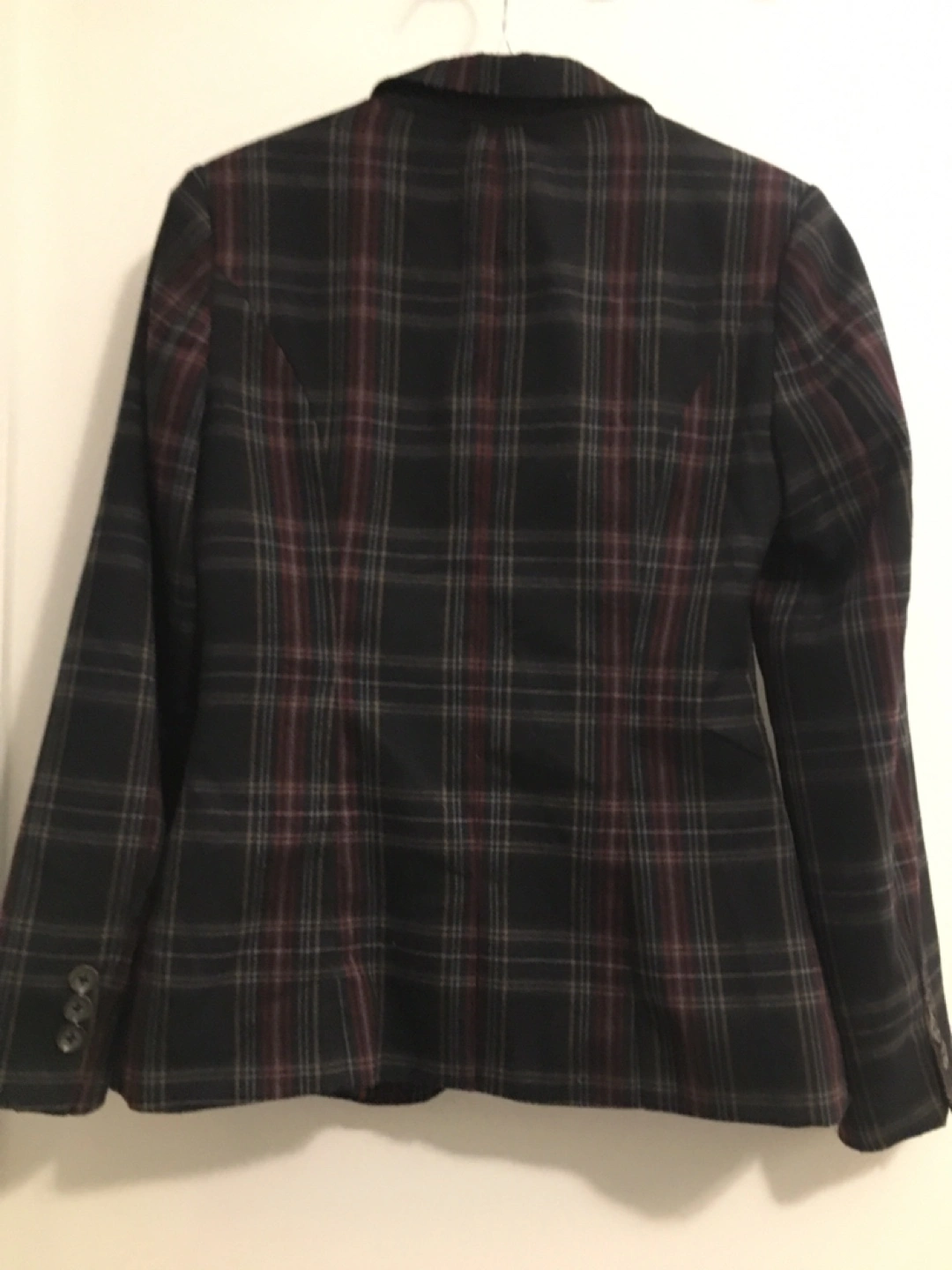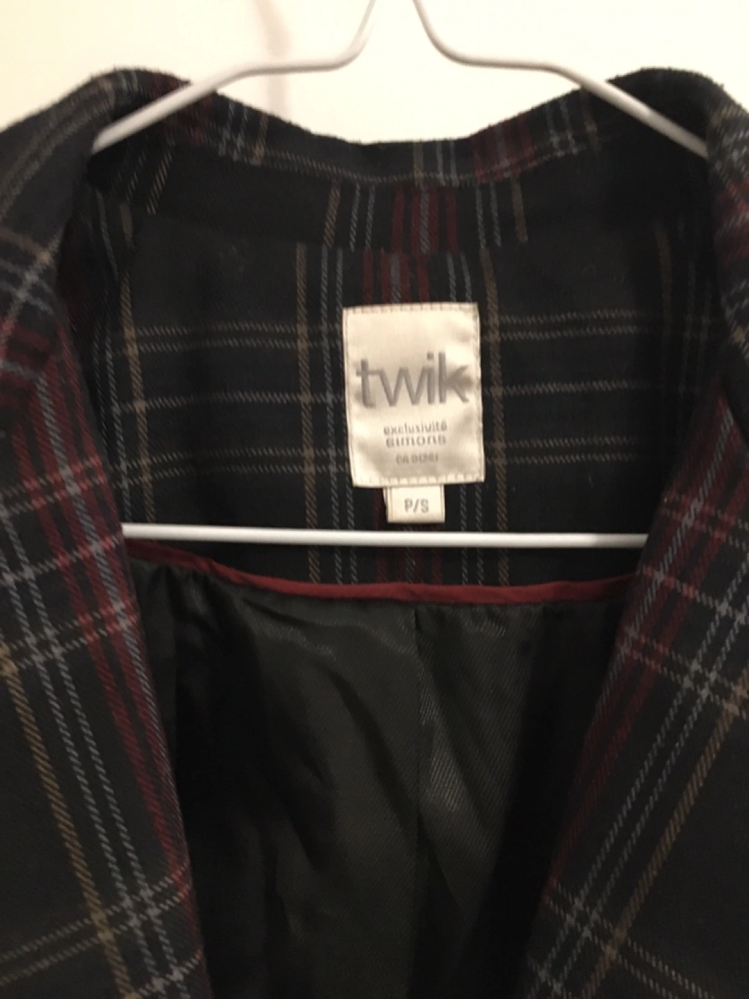 Women's blazer from Simons. Dark-coloured plaid pattern. One button closure. Long sleeves with button cuffs. Great condition. Size P/S.