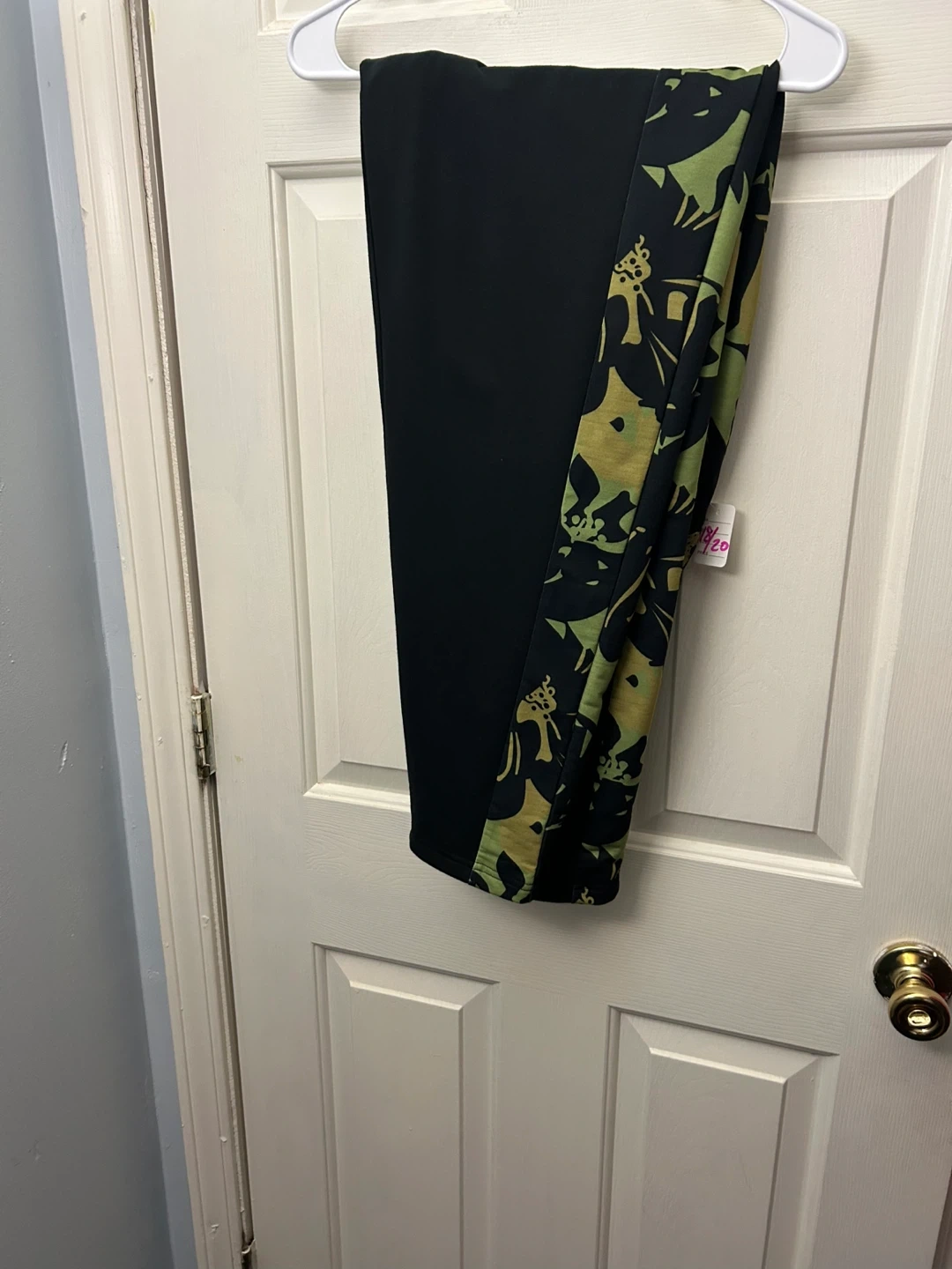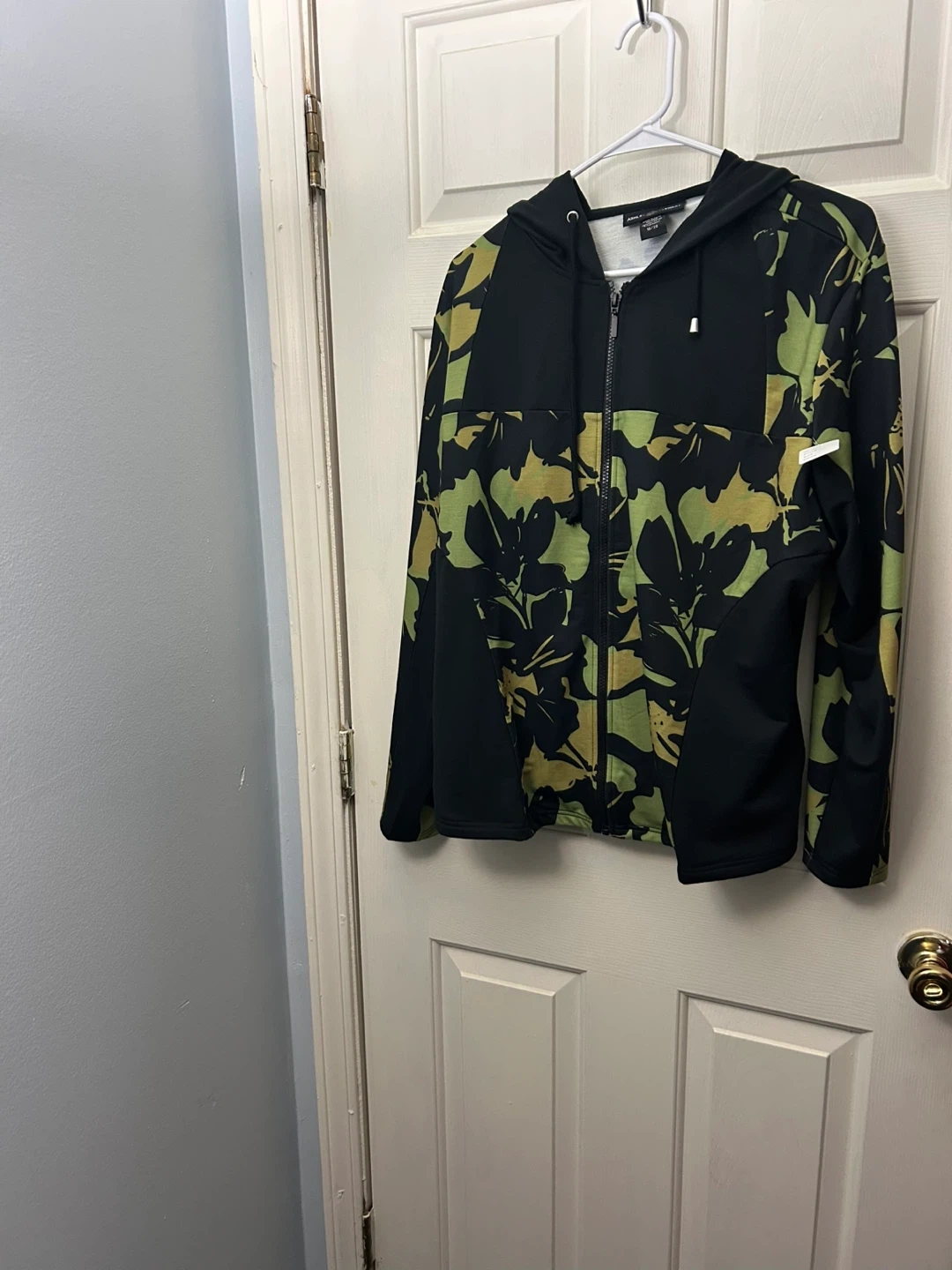 This set includes a black hoodie with a green floral print on the front and sleeves. Matching black pants also feature a green floral print detail on the side. Material is polyester blend.
