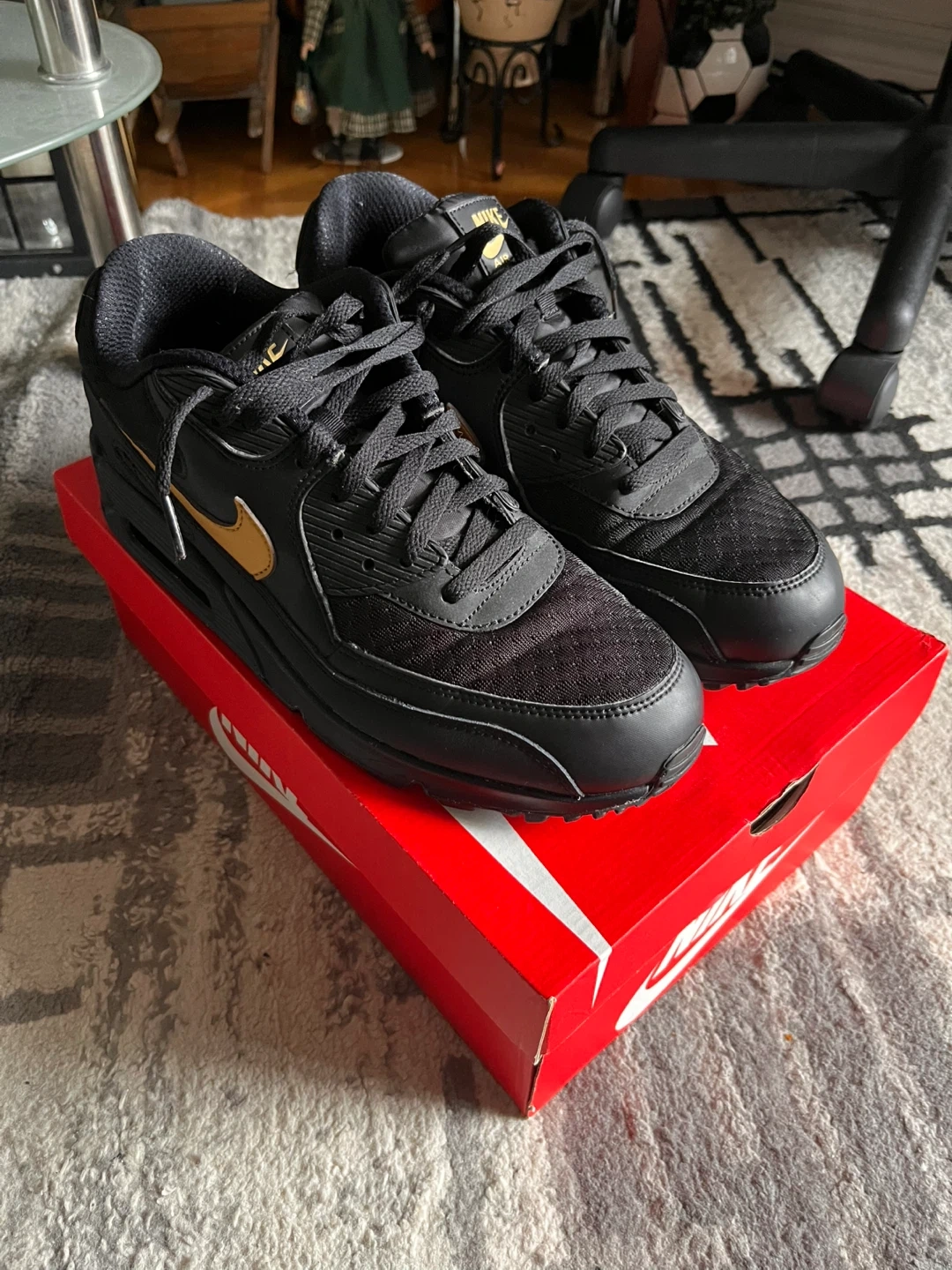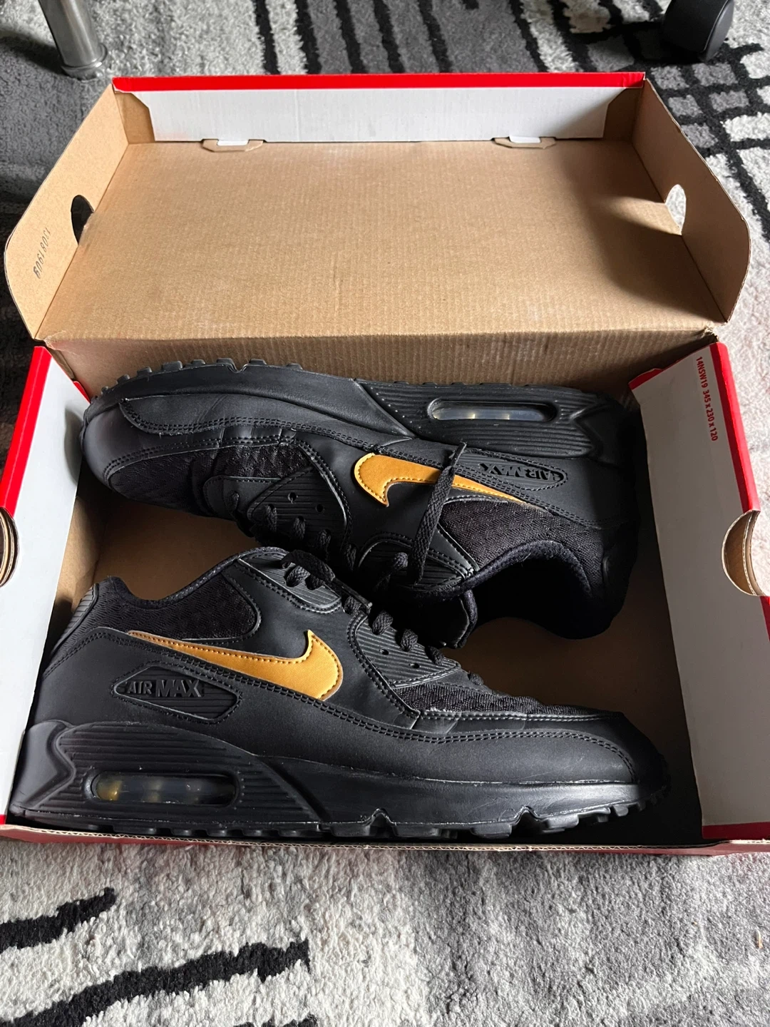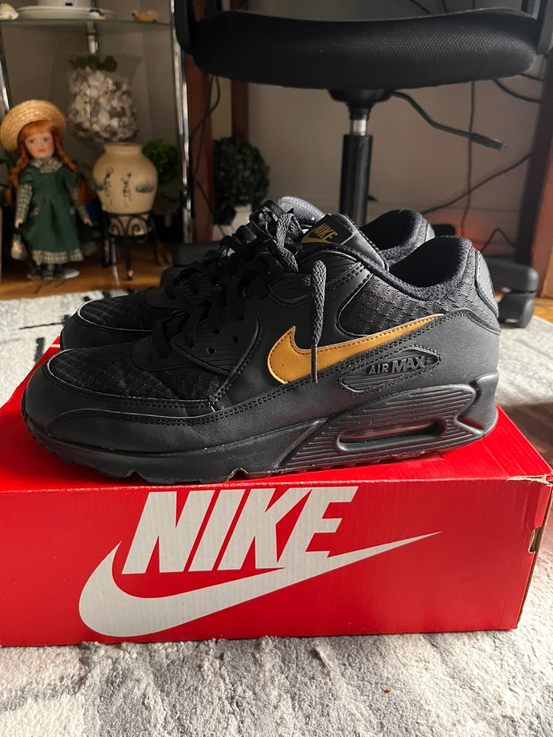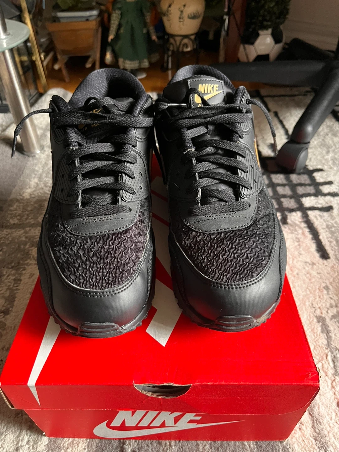 Selling a pair of Nike Air Max 90 Essential sneakers in black and metallic gold. They are a US size 12 and come with the original box. worn but no noticeable defects basically new