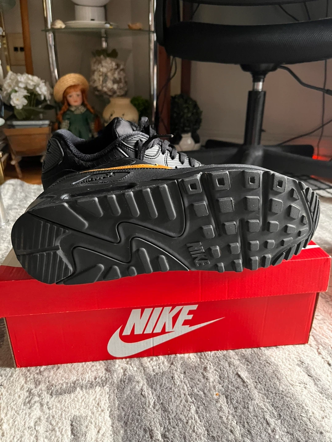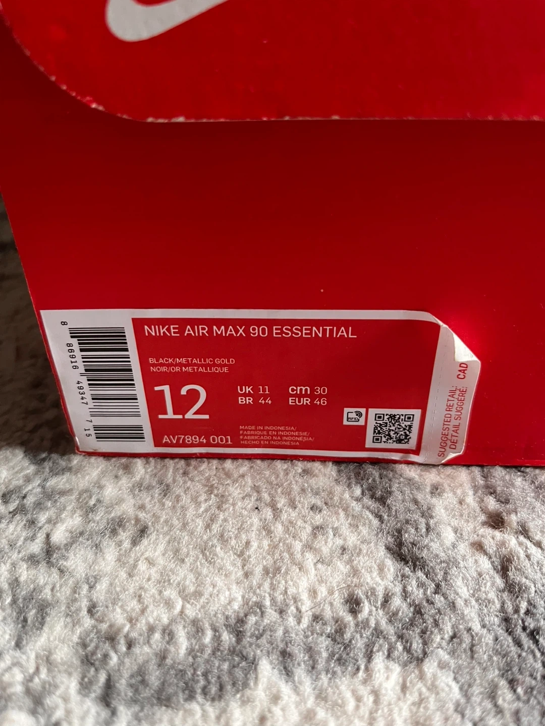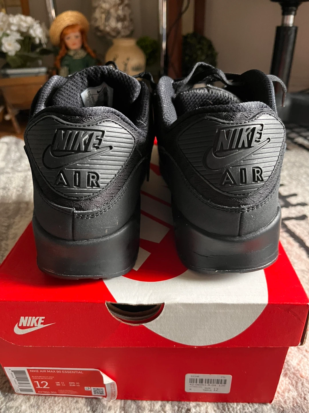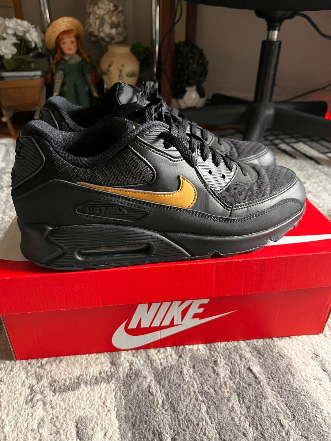 Selling a pair of Nike Air Max 90 Essential sneakers in black and metallic gold. They are a US size 12 and come with the original box. worn but no noticeable defects basically new