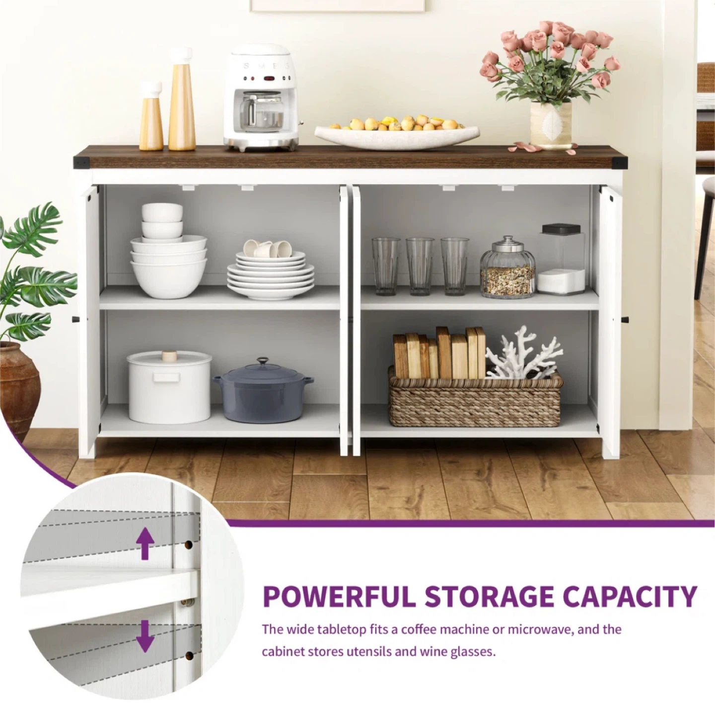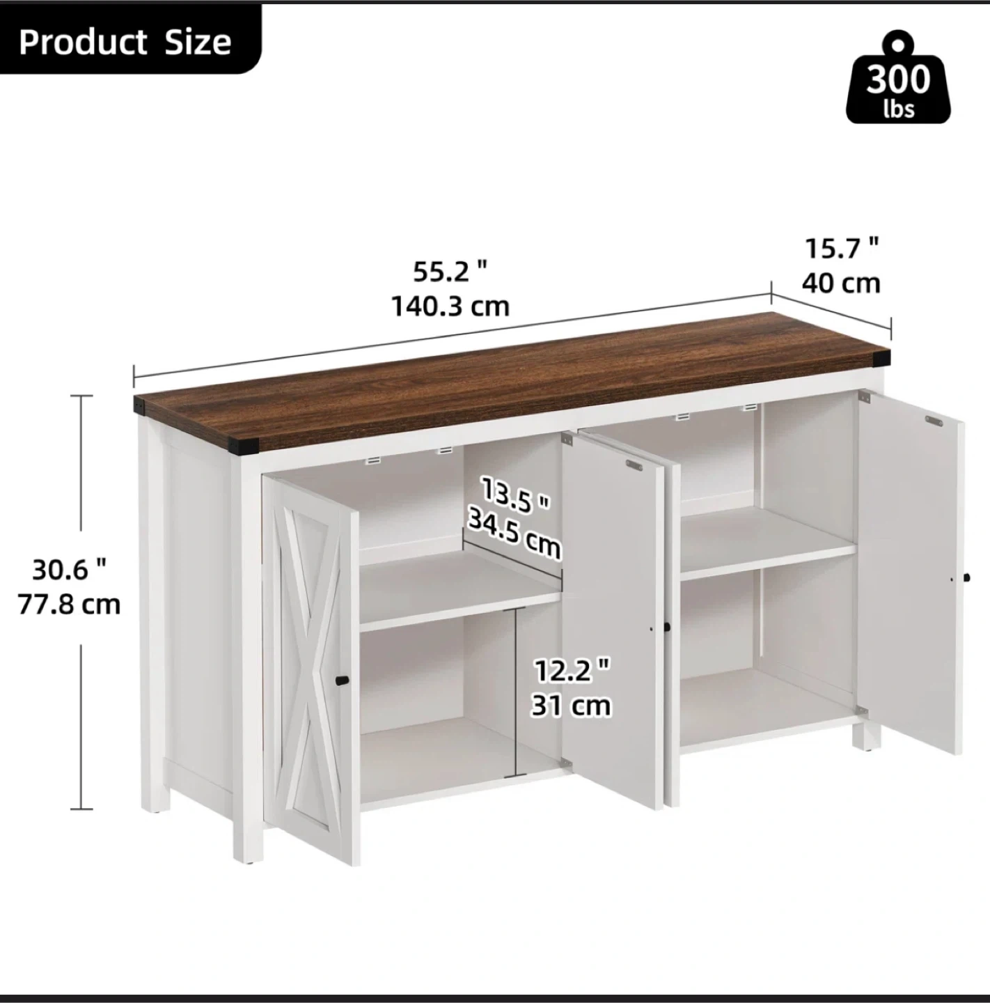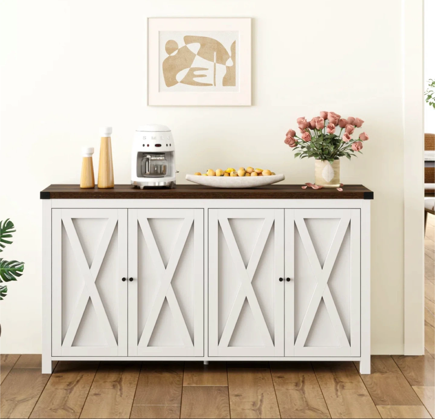 This Esai sideboard offers a stylish and functional storage solution for your home. It features a white and brown finish, adding a touch of modern farmhouse charm to any room. With its 4 doors, it provides ample space for storing dishes, linens, or other household items. The dimensions are approximately 55 inches wide, 30 inches tall, and 15 inches deep.