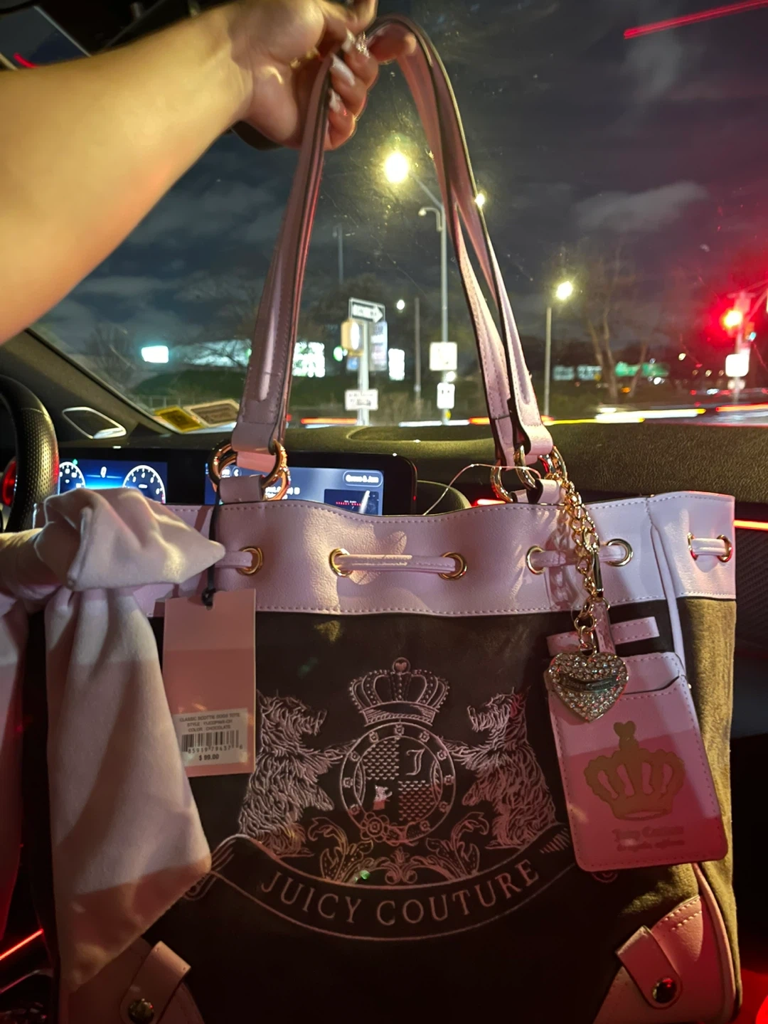 Juicy Couture Classic Scottie Dogs Tote. Chocolate brown and light pink colorblocking. Features the signature crest logo with scottie dogs. Includes a crown charm and matching cardholder.