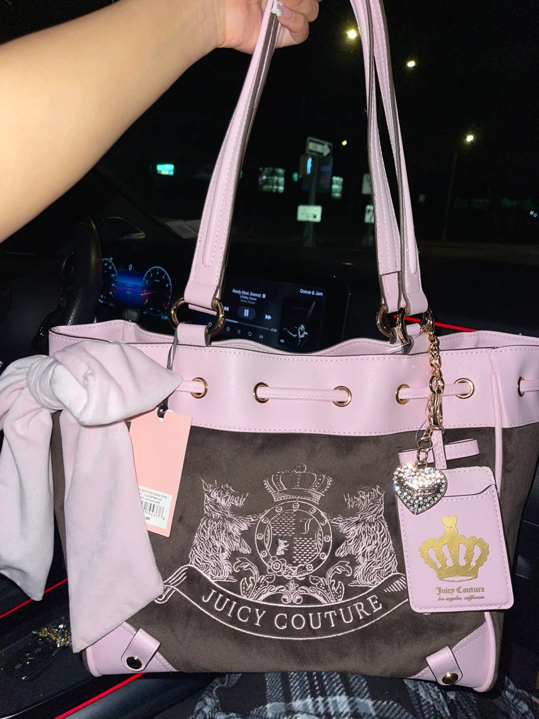 Juicy Couture Classic Scottie Dogs Tote. Chocolate brown and light pink colorblocking. Features the signature crest logo with scottie dogs. Includes a crown charm and matching cardholder.