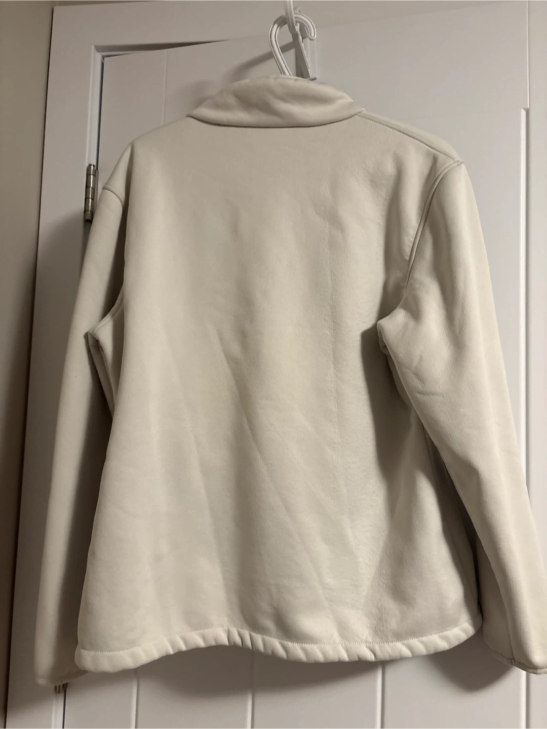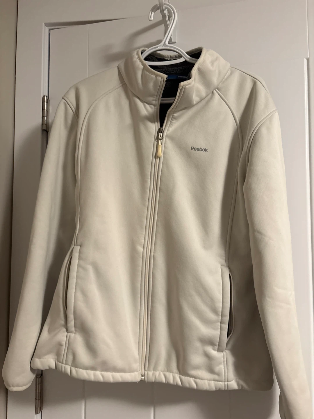 This is a Reebok women’s zip-up fleece jacket. It's cream coloured. Fits L/XL. Water repellent exterior and sherpa lined exterior