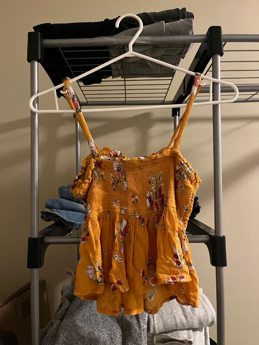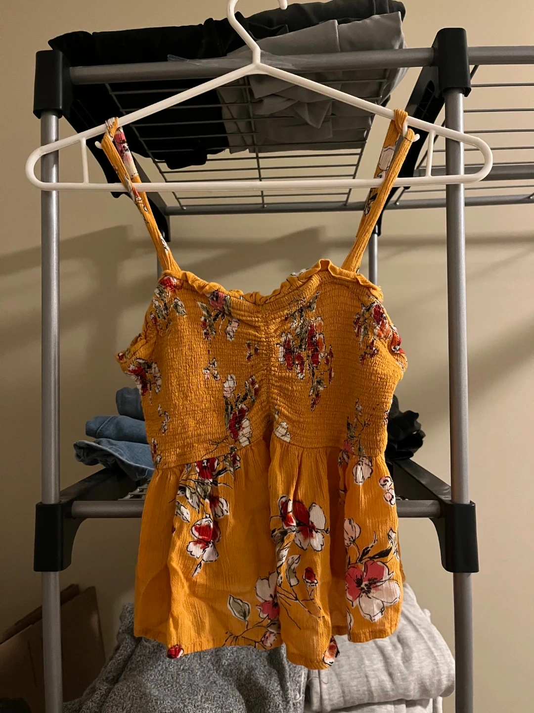 This yellow cami top features a floral print and a smocked bodice with ruffled trim. It has adjustable spaghetti straps and a peplum hem. It's a breezy piece perfect for warmer weather!