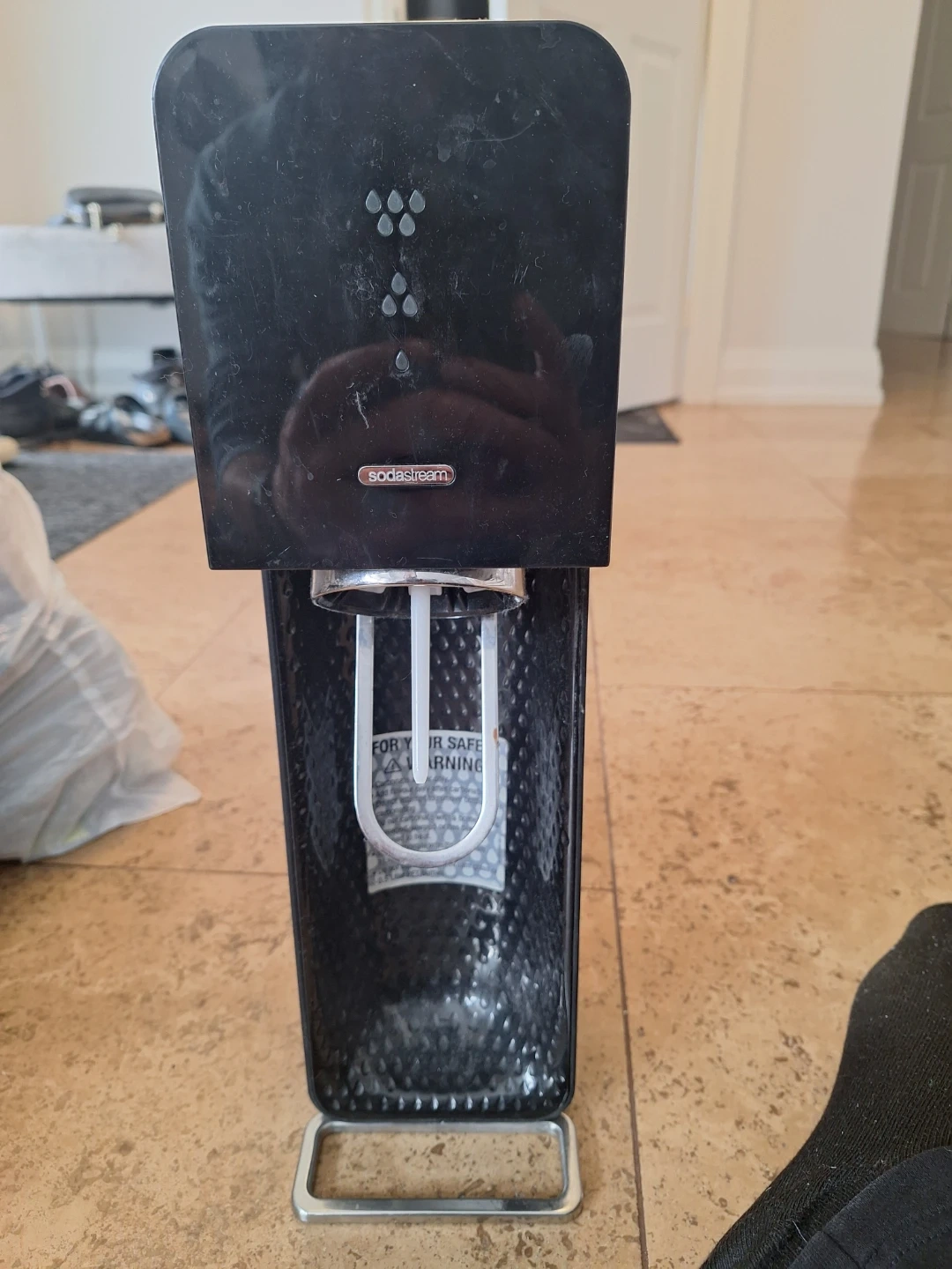This is a black SodaStream sparkling water maker. It's made of plastic with a metal base. This machine carbonates water for easy homemade fizzy drinks!
