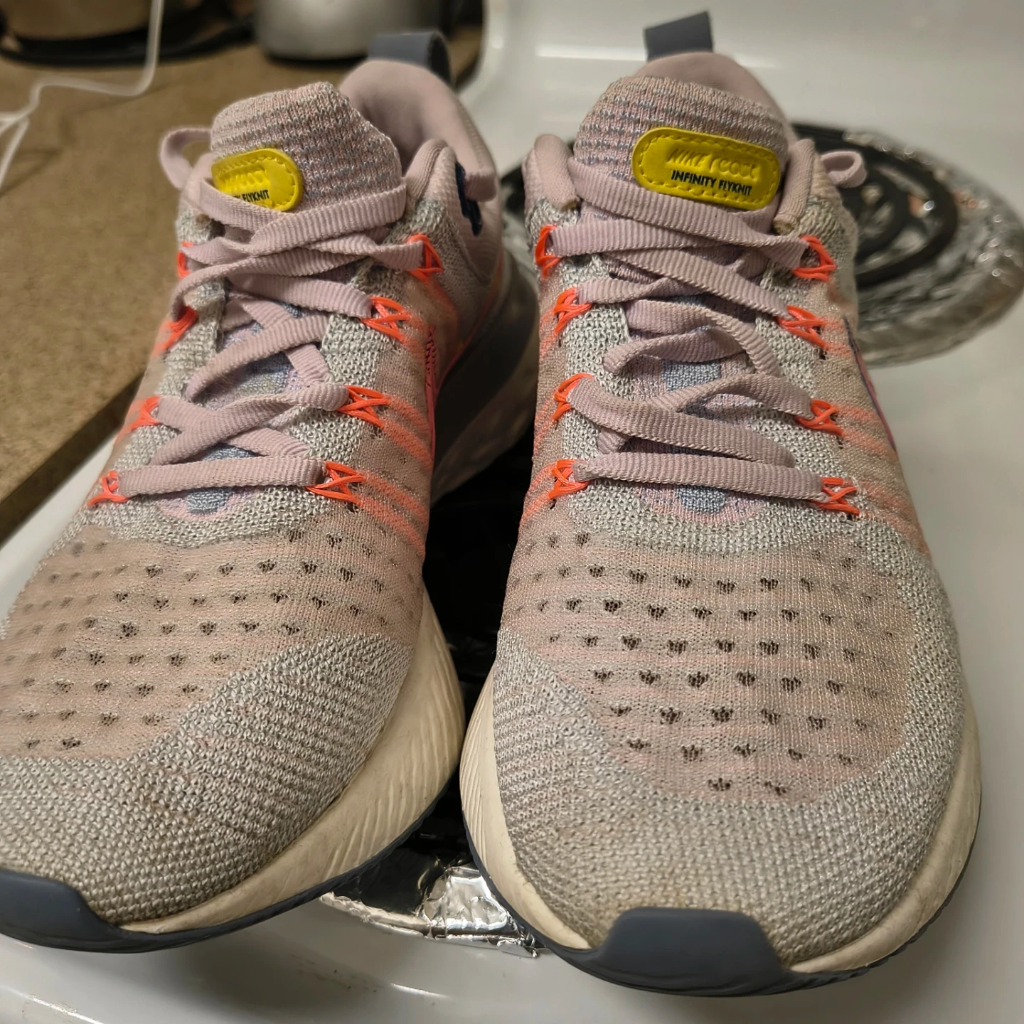 These Nike running shoes feature a light pink and grey knit upper with pink and orange accents. They're built with Nike React technology for a smooth ride. The pull tabs at the heel and tongue make them easy to slip on. These are women's size 7