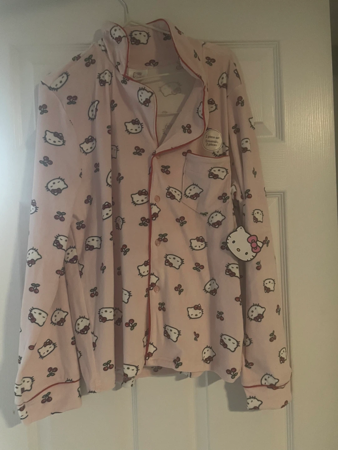 This is a two-piece Hello Kitty pajama set. It includes a button-up top and pants. Both pieces are pink with a pattern of Hello Kitty faces and cherries. The size is M/M. The material is soft and cozy. Brand New