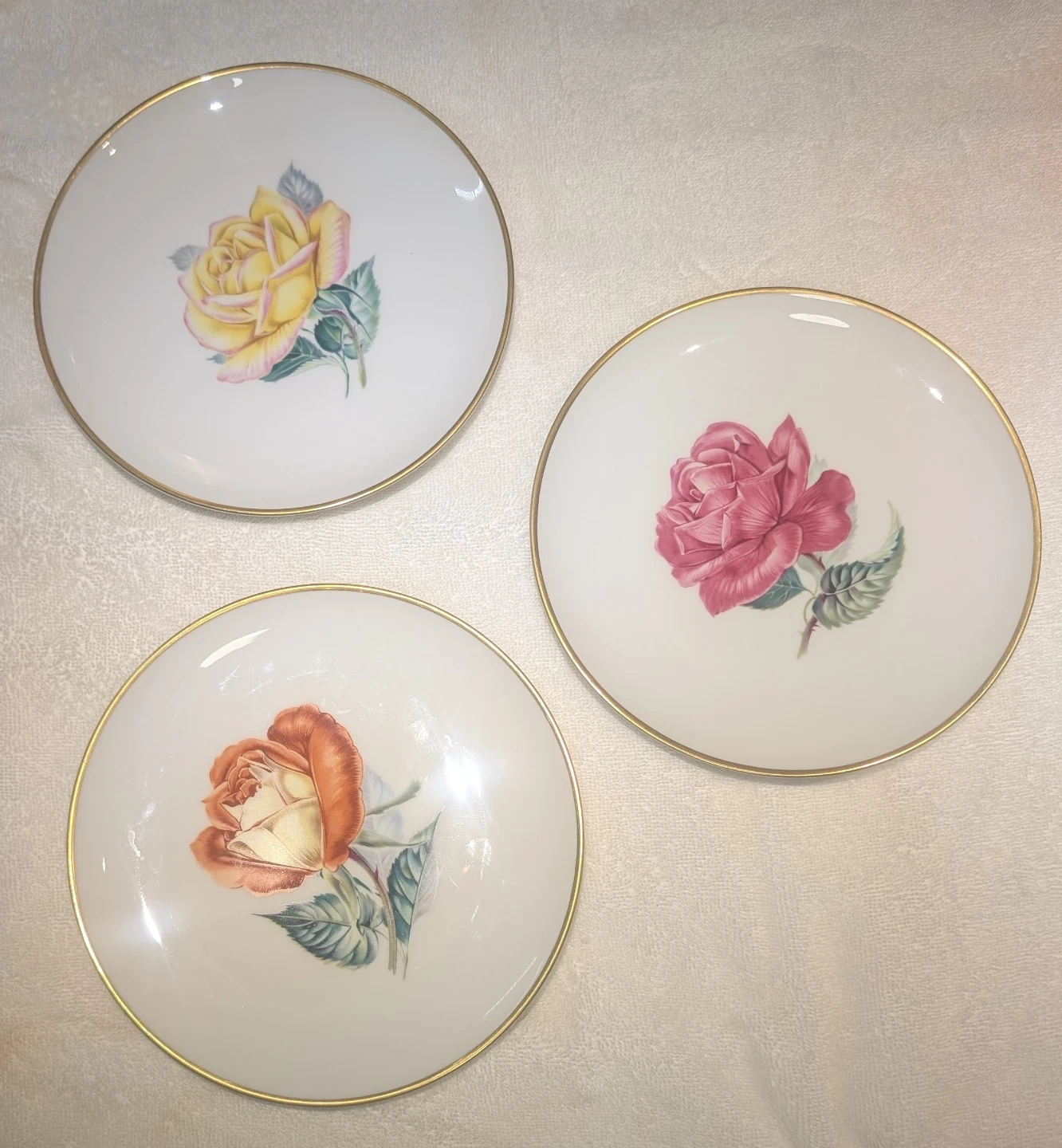 Set of three decorative porcelain plates from Heinrich. Each plate features a different rose design: one orange, one pink, and one yellow. Plates have a gold rim and measure approximately 8 inches in diameter. They're perfect for display or adding a touch of elegance to your home. Porcelain material.