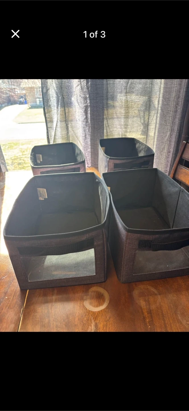 Four dark grey fabric storage bins with clear front windows and handle cutouts. They're great for organizing shelves or closets. These bins are collapsible for easy storage when not in use.