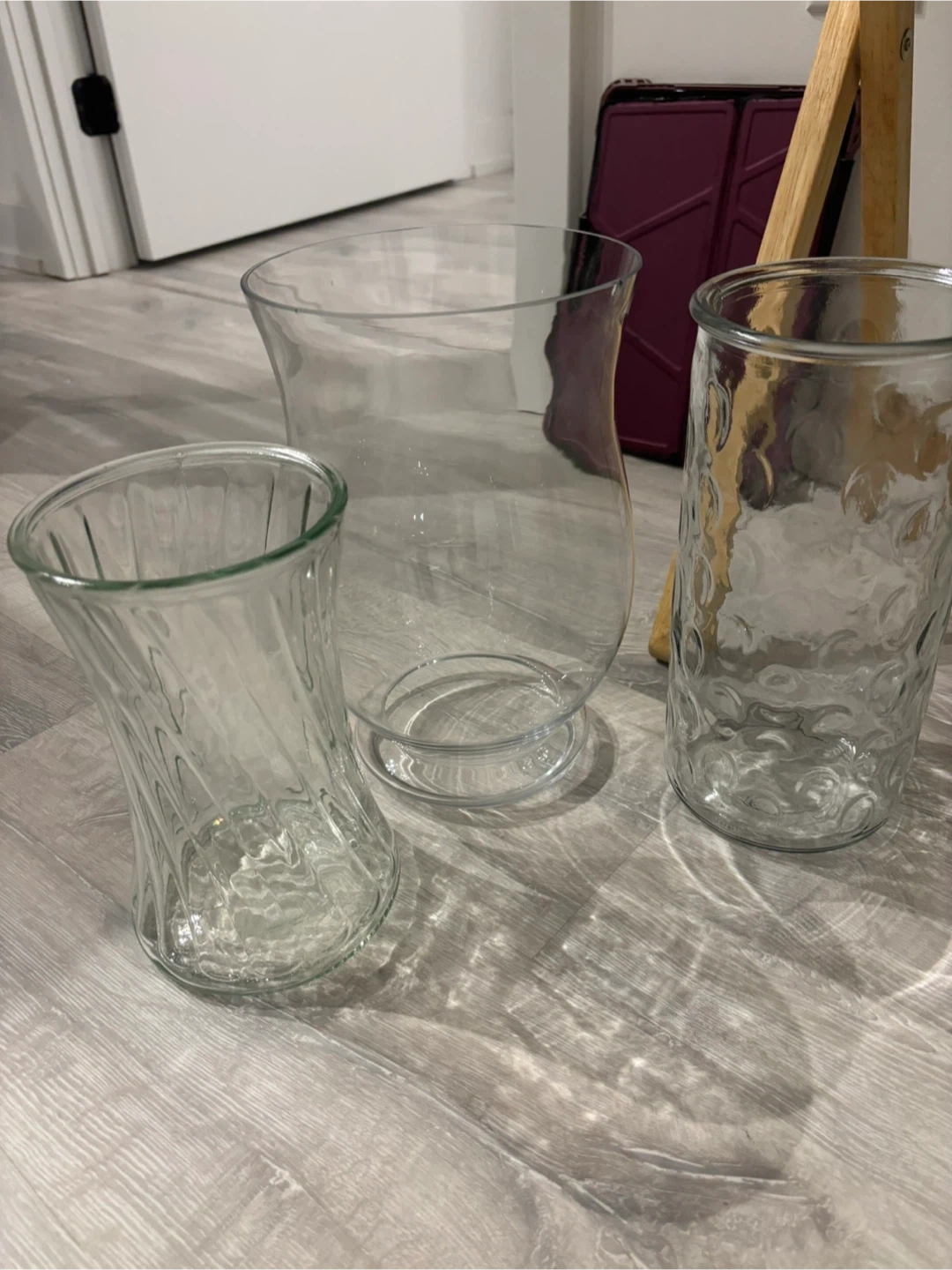 This set includes three clear glass vases. One vase has a twisted design, another has a dimpled pattern, and the third is a classic hurricane shape. Glass material.