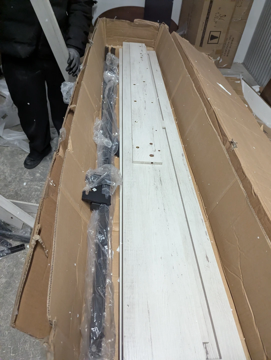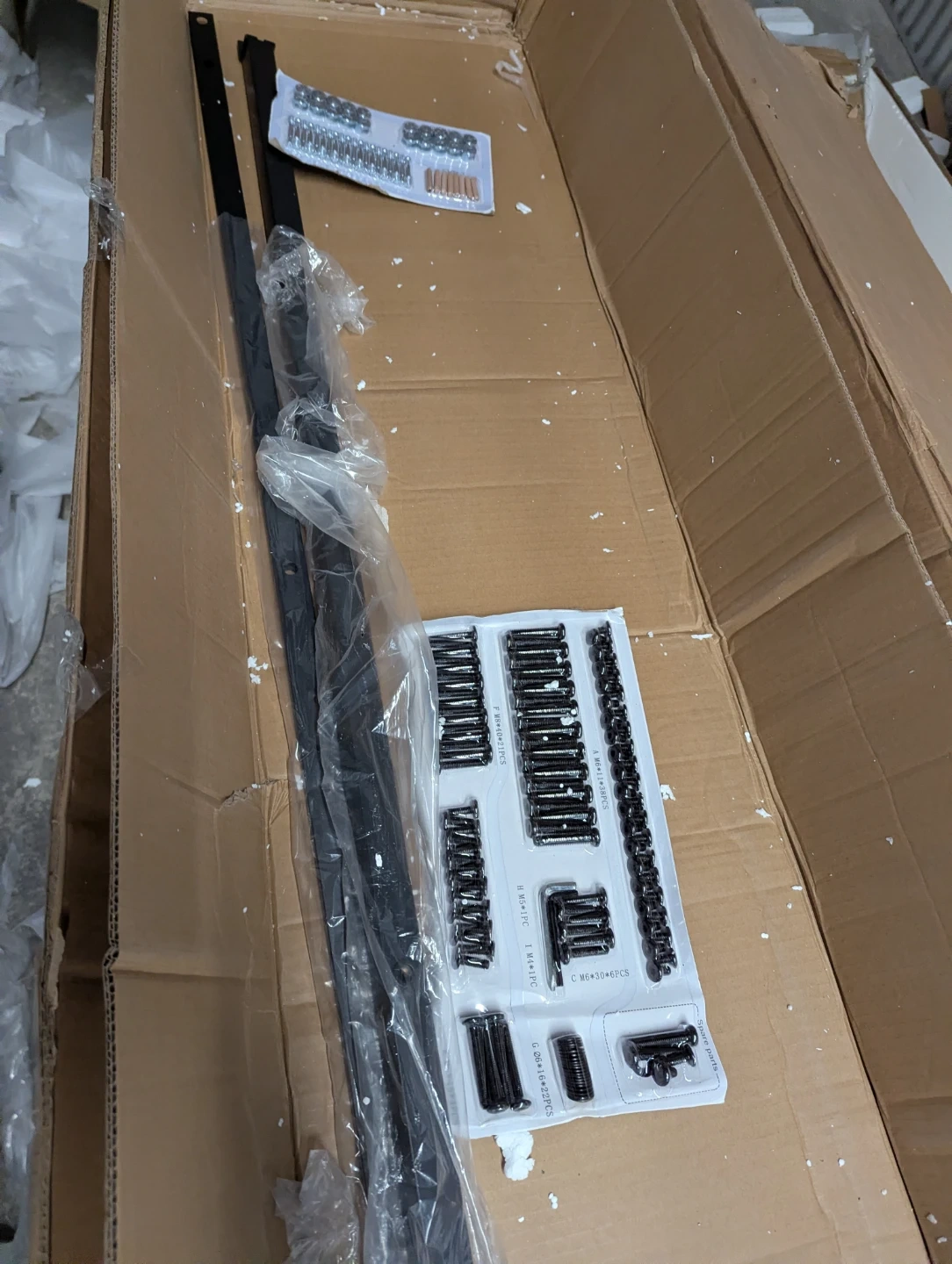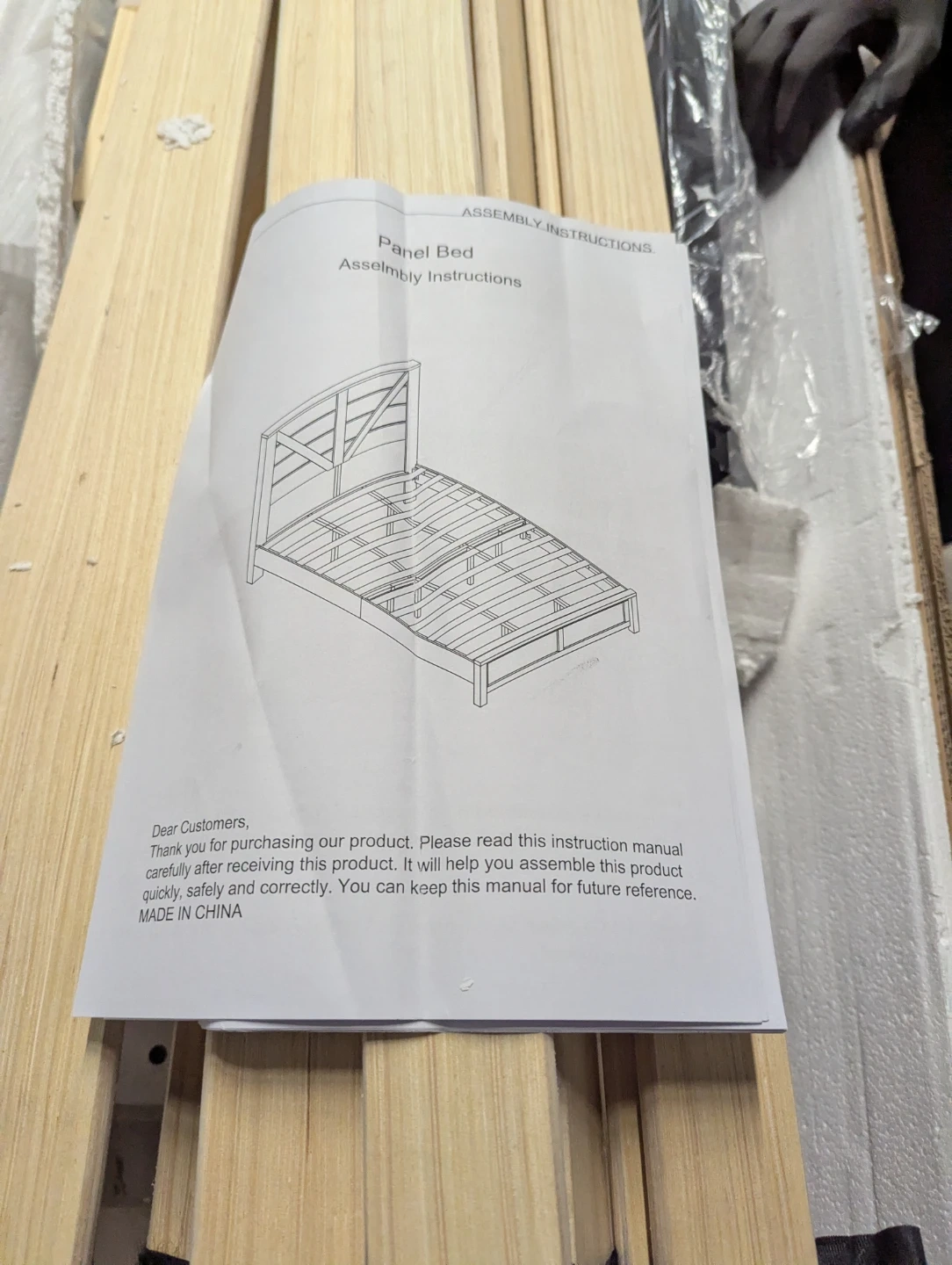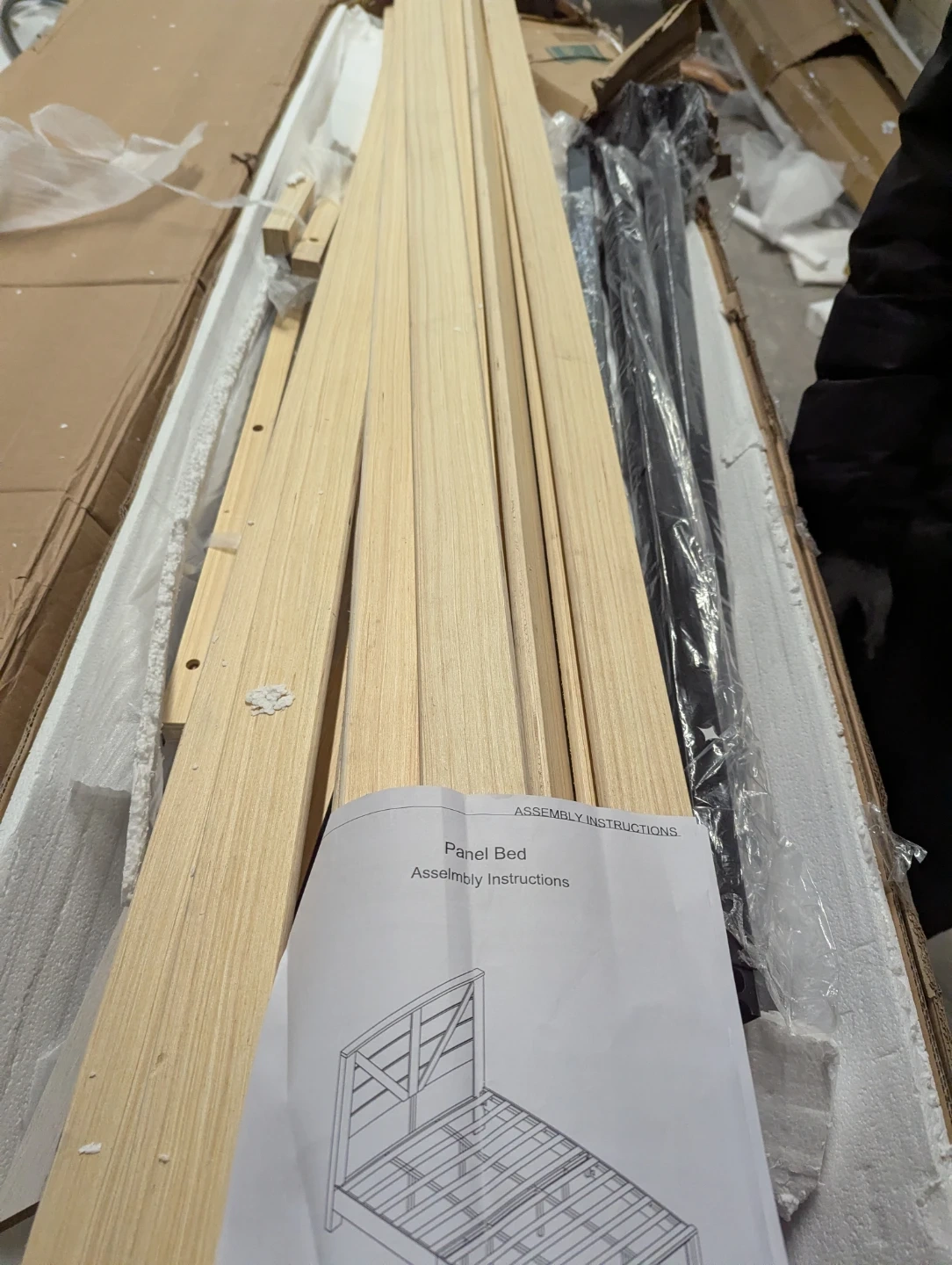 Includes all parts for a panel bed frame. Assembly instructions are provided. Wooden slats and metal frame components are included. All hardware is packaged and ready for assembly.