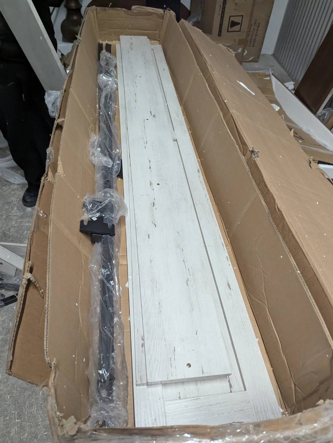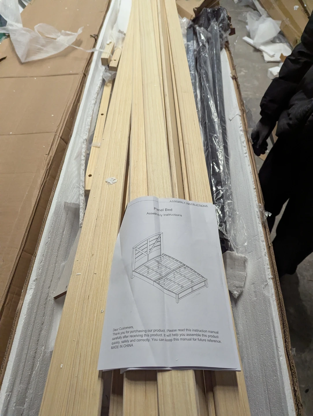 Includes all parts for a panel bed frame. Assembly instructions are provided. Wooden slats and metal frame components are included. All hardware is packaged and ready for assembly.