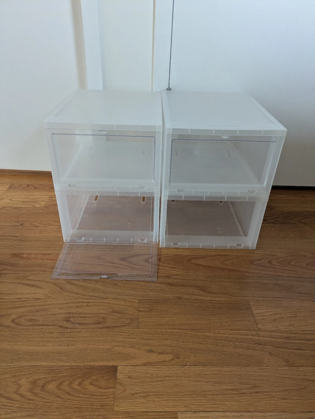 2 individual, stackable storage boxes with drop-front doors. They're made of durable plastic and can be used to organize shoes or other items.