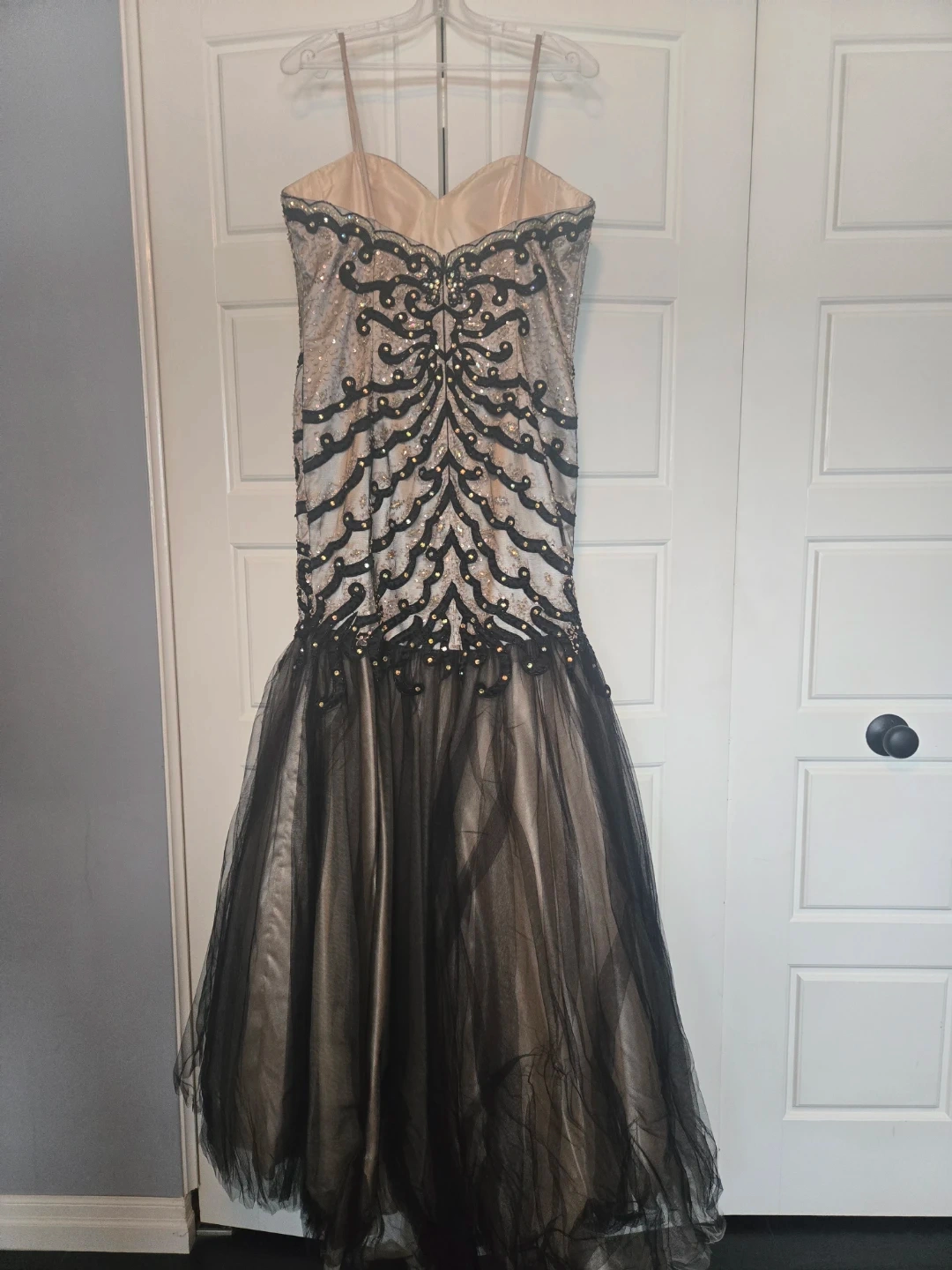 Selling a beautiful prom dress in black and beige. It features intricate beaded detailing on the bodice and a flowing tulle skirt. Perfect for a special occasion!