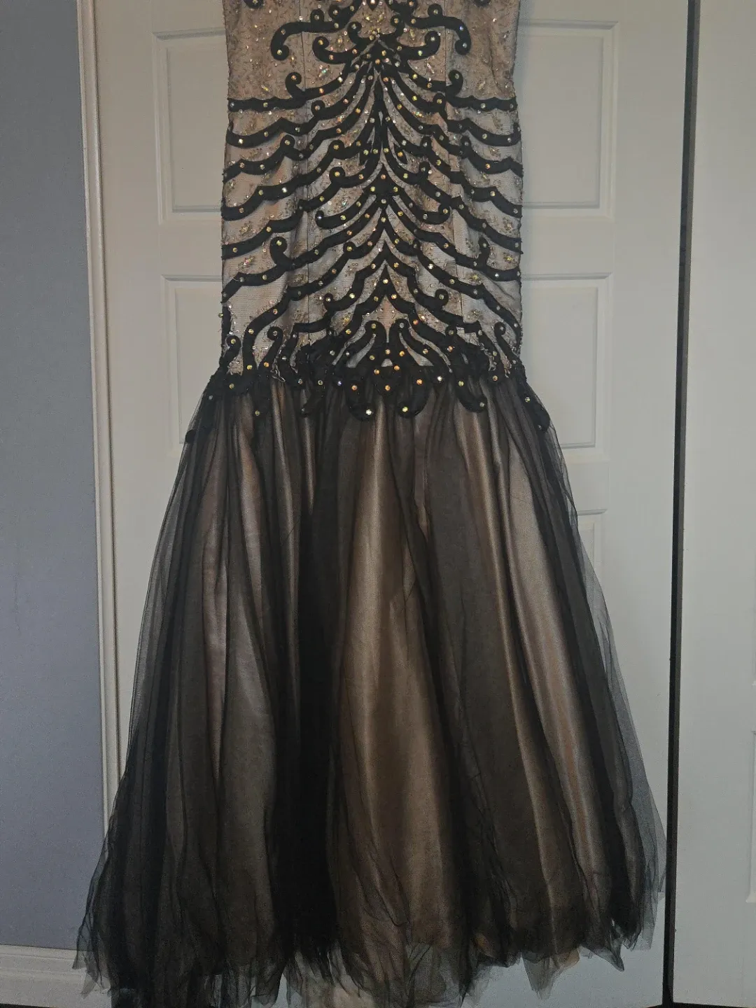 Selling a beautiful prom dress in black and beige. It features intricate beaded detailing on the bodice and a flowing tulle skirt. Perfect for a special occasion!