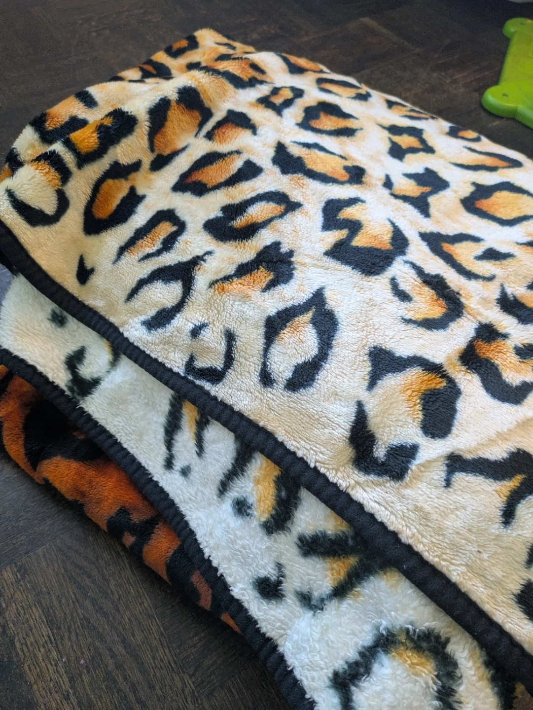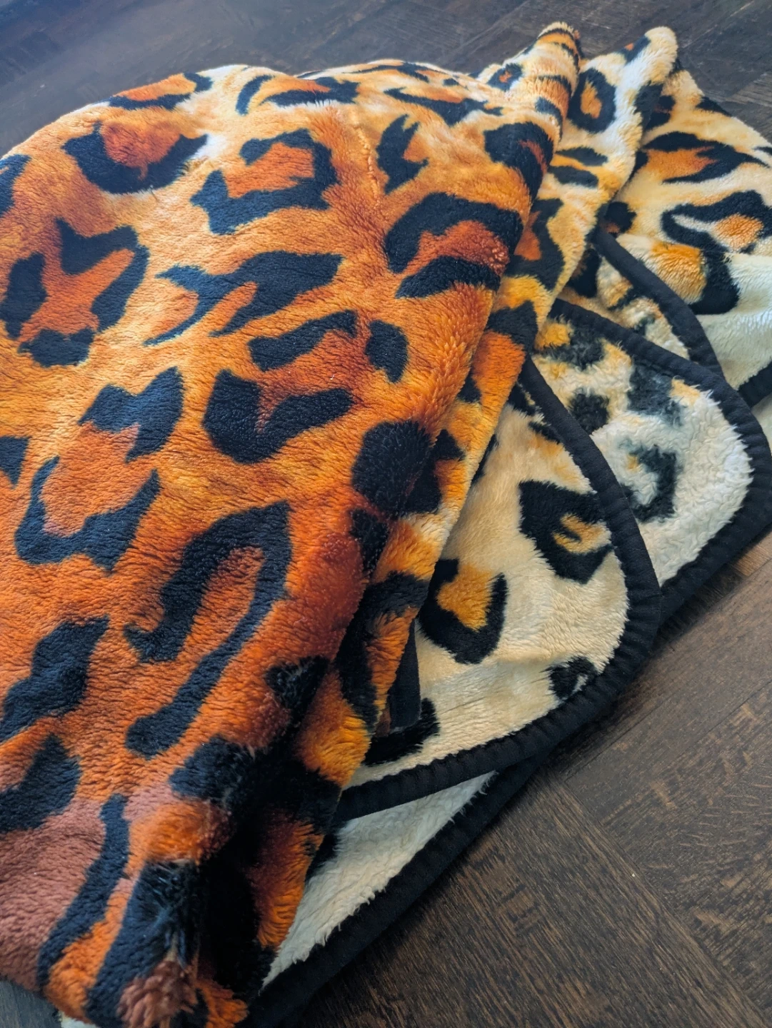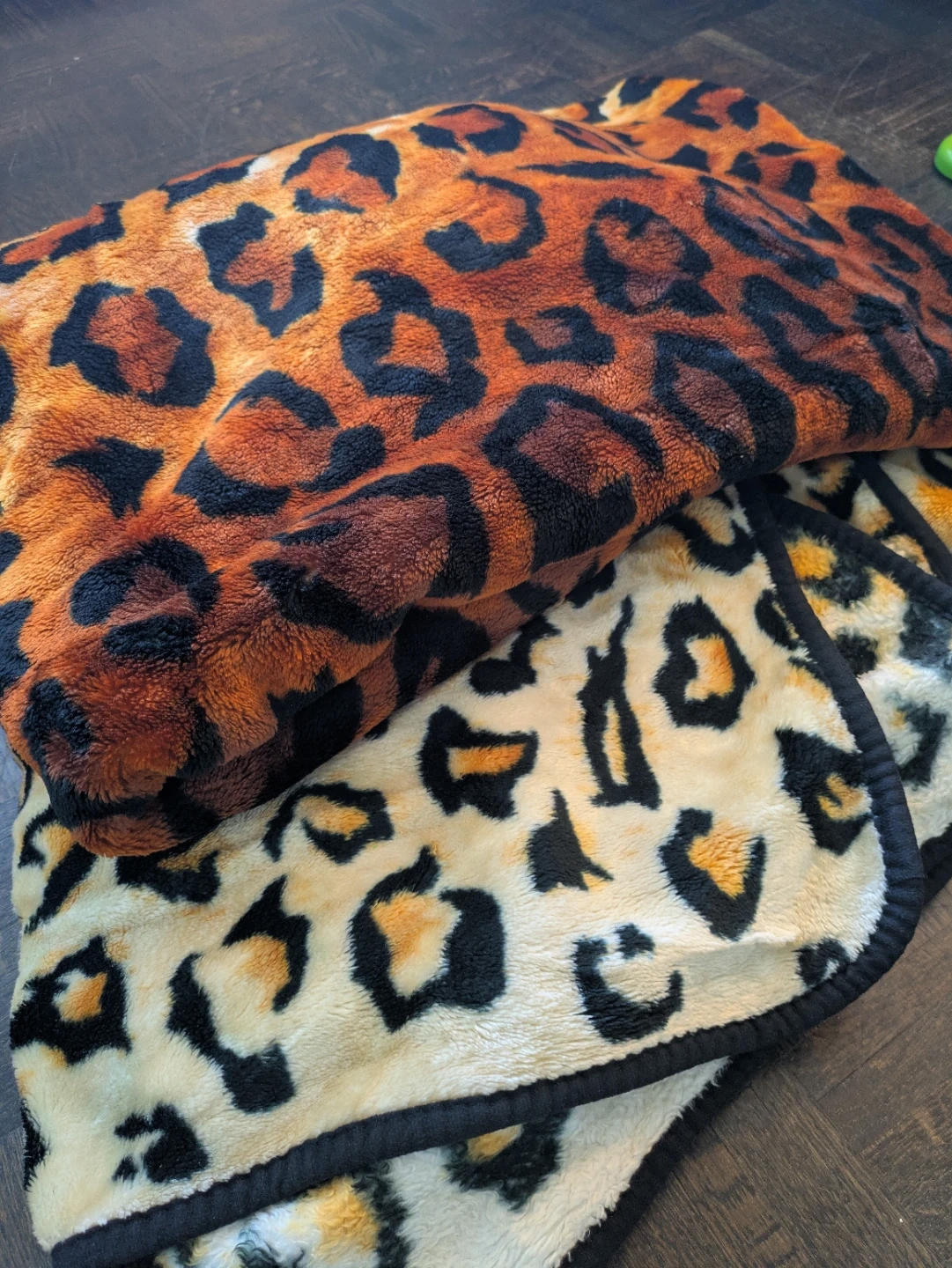 Snuggle up with this cozy throw blanket! It features a fun leopard print design in shades of brown and cream.