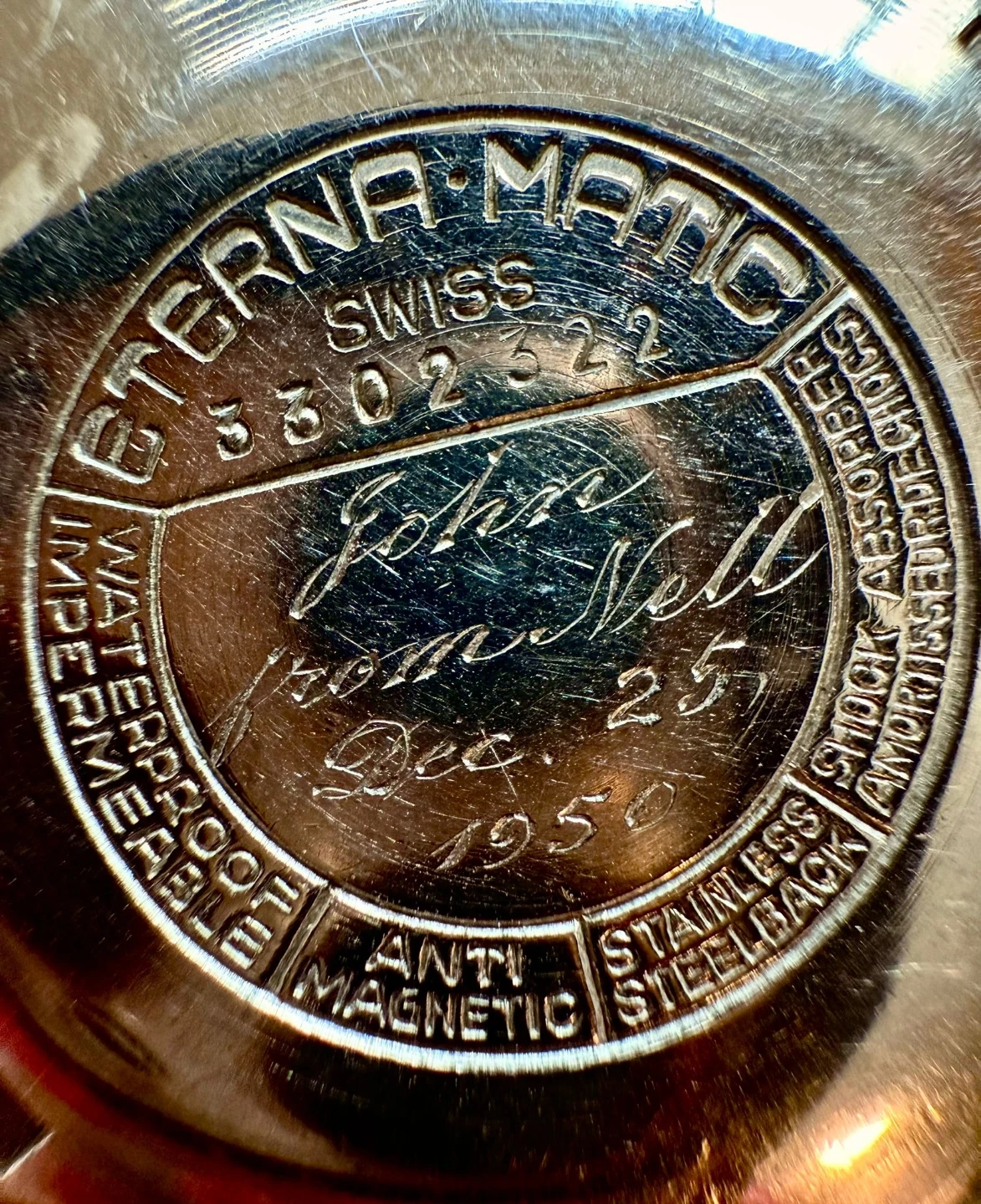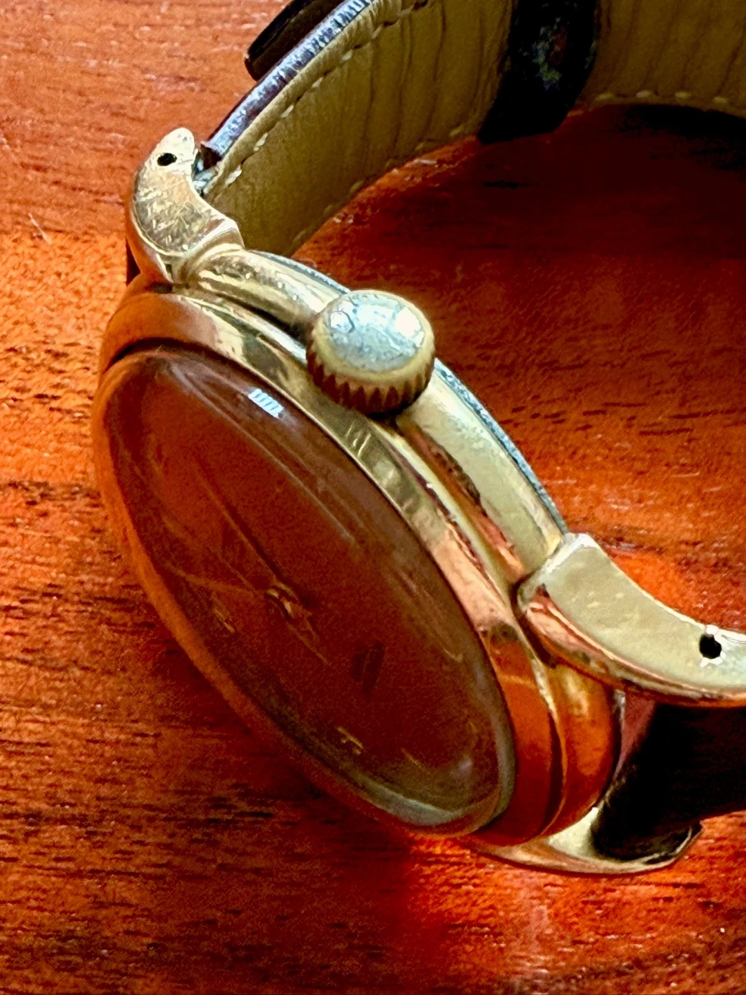 28Selling an Eterna-Matic Birks Challenger automatic watch. It has a gold-tone case and a leather strap. The back of the watch is stainless steel.