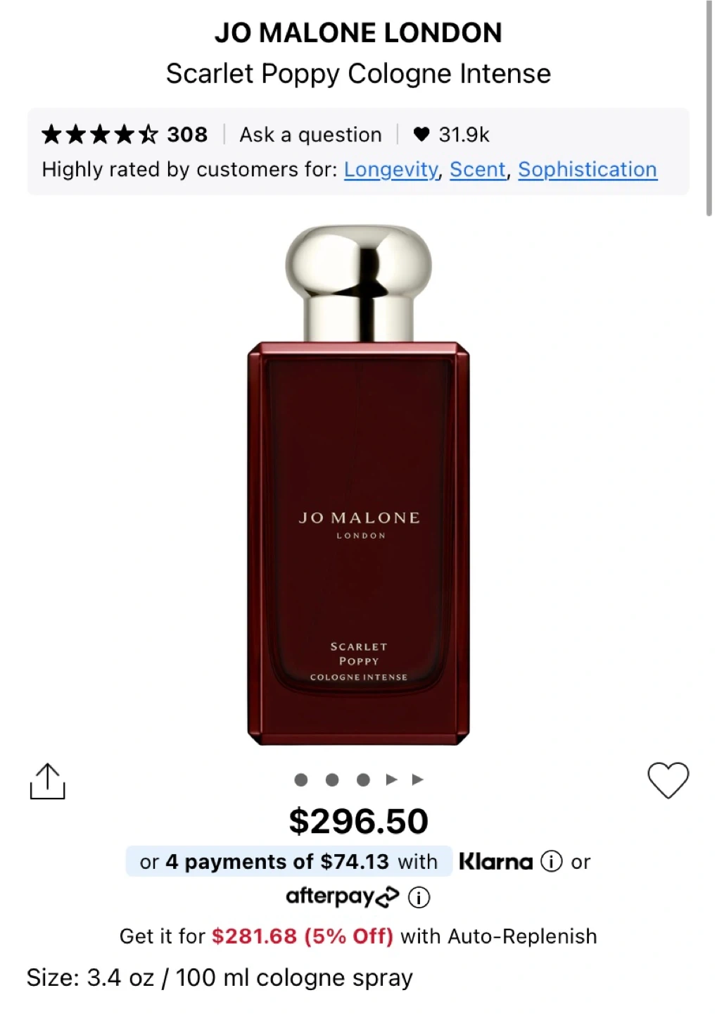 Selling a bottle of Jo Malone's Scarlet Poppy Cologne Intense. It's a 3.4 oz / 100 ml cologne spray. The bottle comes with its original box.
