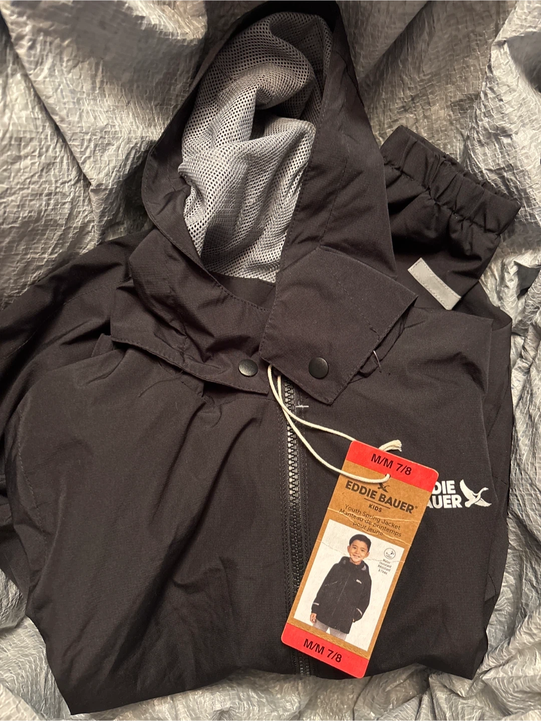 Eddie Bauer Kids youth spring jacket in black. It's water resistant. Size M/M 7/8. This jacket is great for cooler, wet spring days.