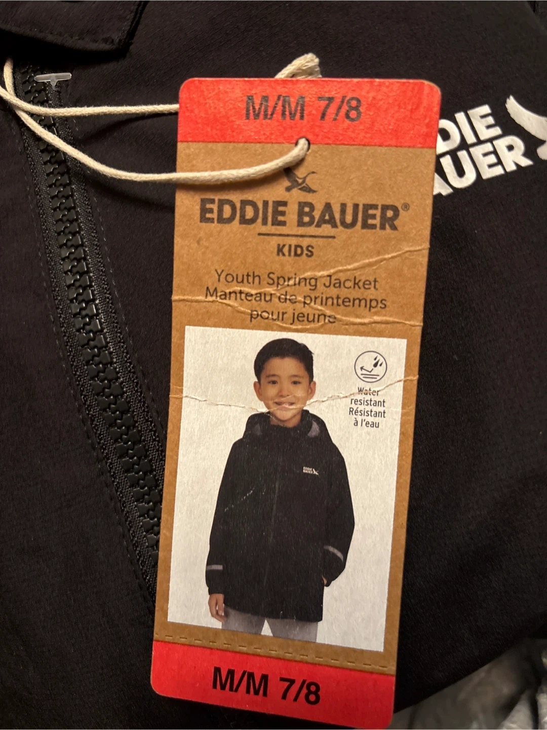 Eddie Bauer Kids youth spring jacket in black. It's water resistant. Size M/M 7/8. This jacket is great for cooler, wet spring days.