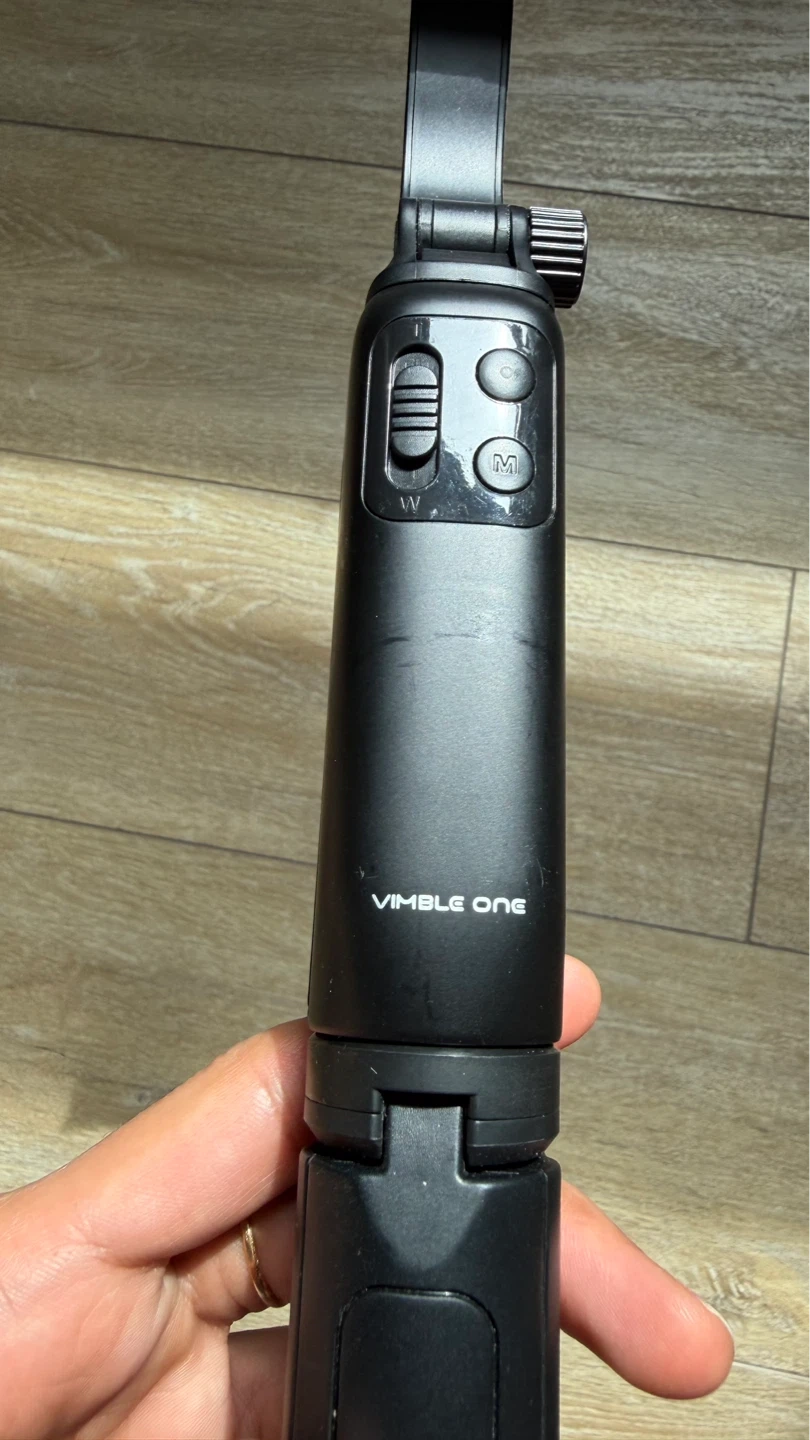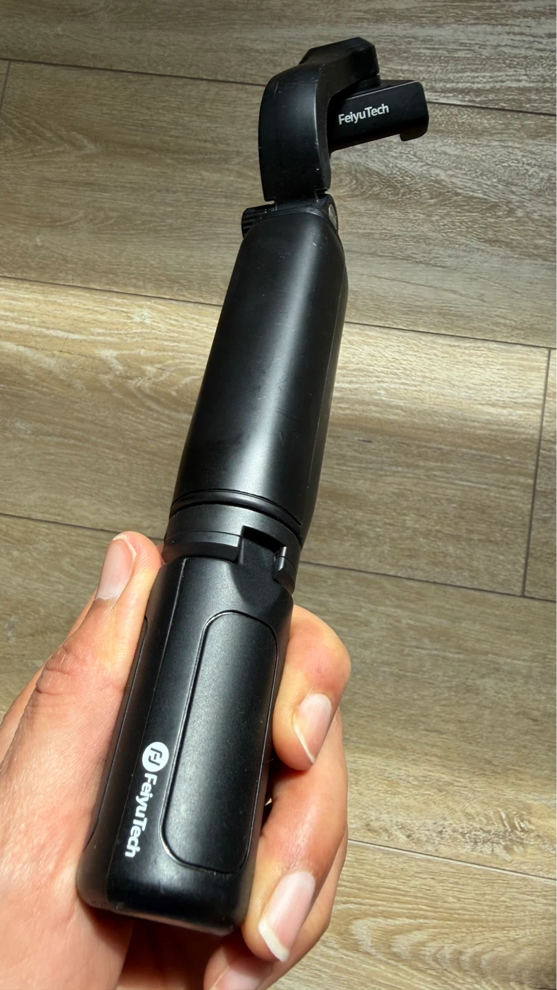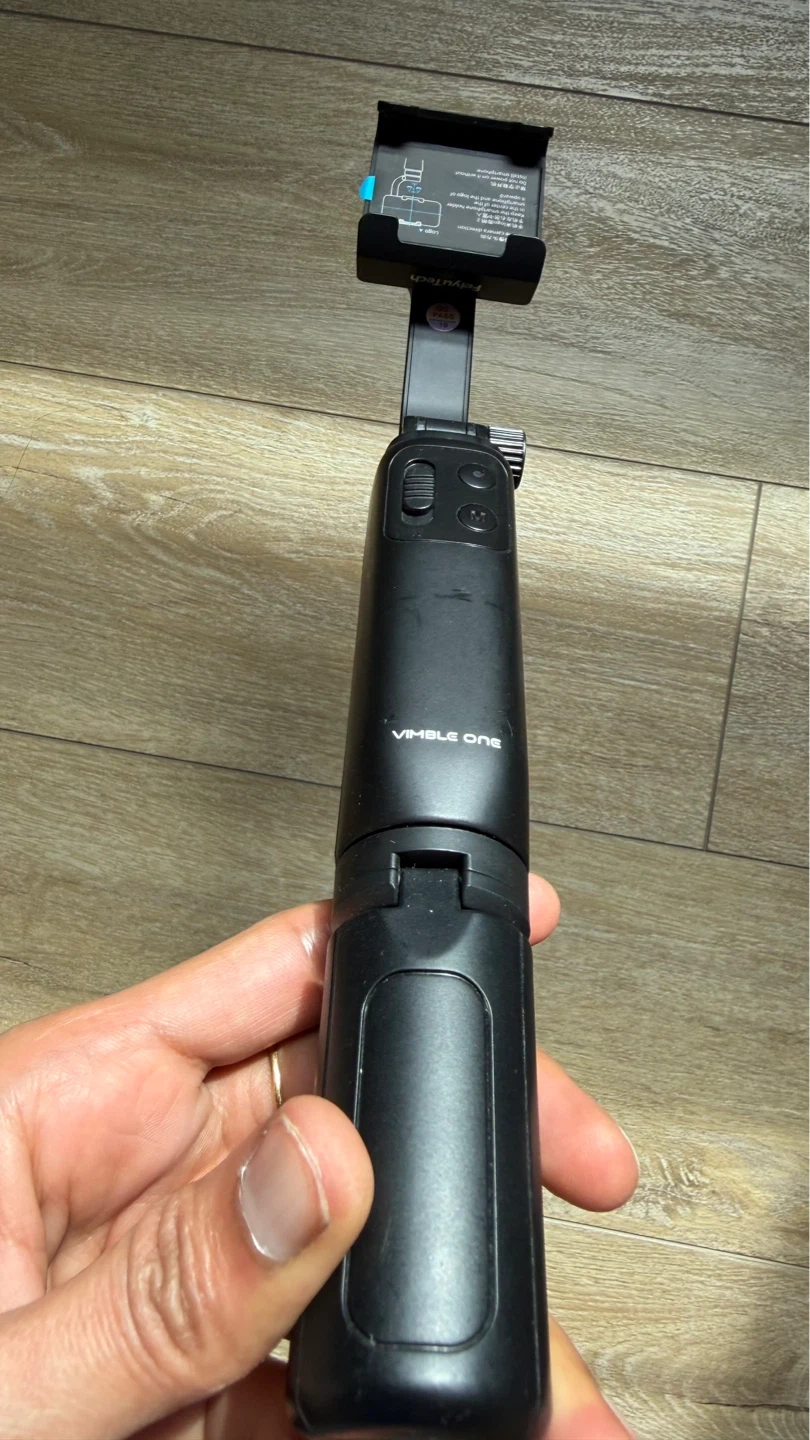This is a FeiyuTech Vimble One gimbal stabilizer. It's designed for phones. The grip is ergonomic and it's made of black plastic.