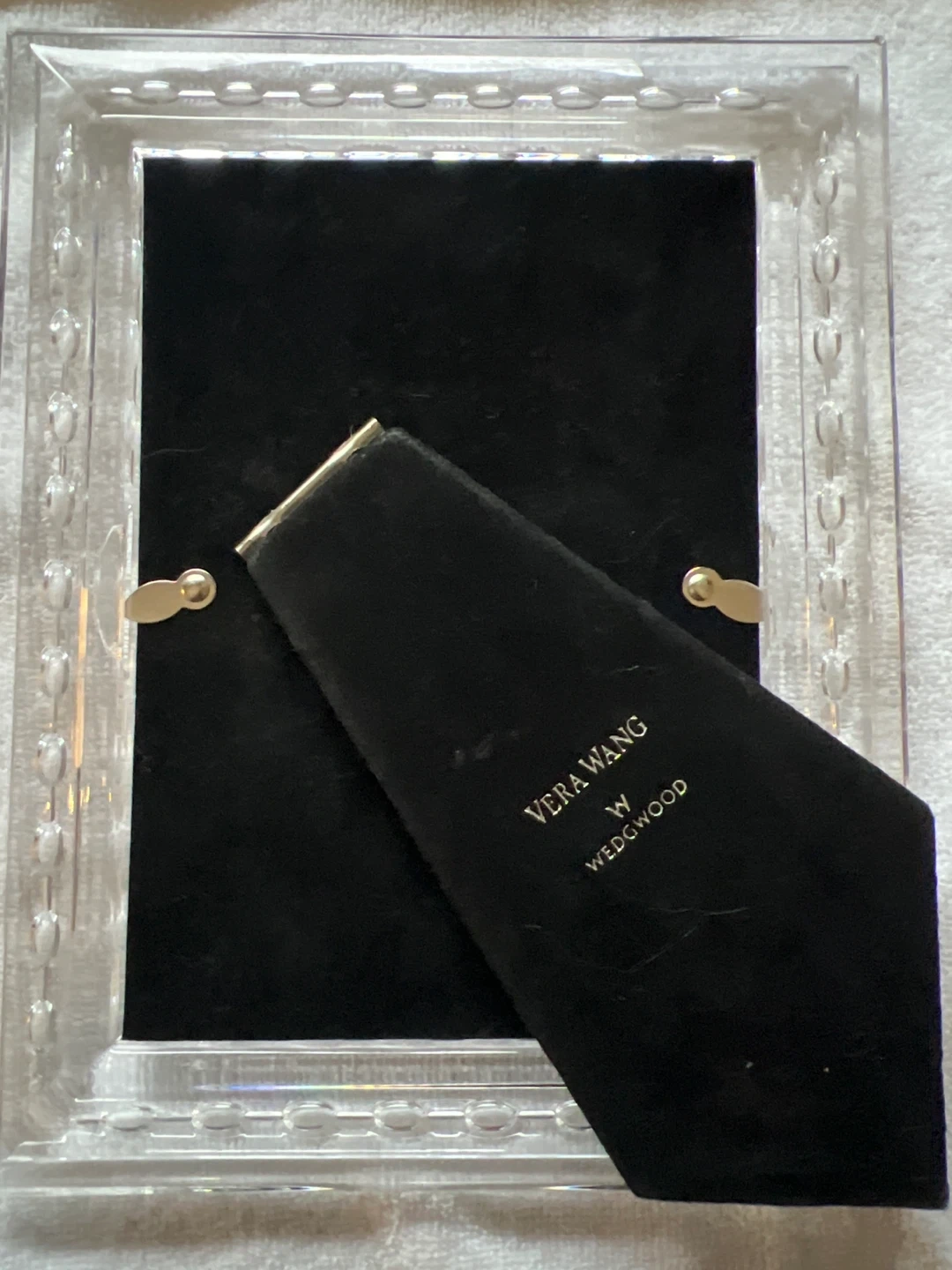 A beautiful crystal picture frame by Vera Wang Wedgwood. It features a clear, faceted design and a black velvet backing with an easel stand. Perfect for displaying your cherished memories! Perfect for a 5 x 7 picture.