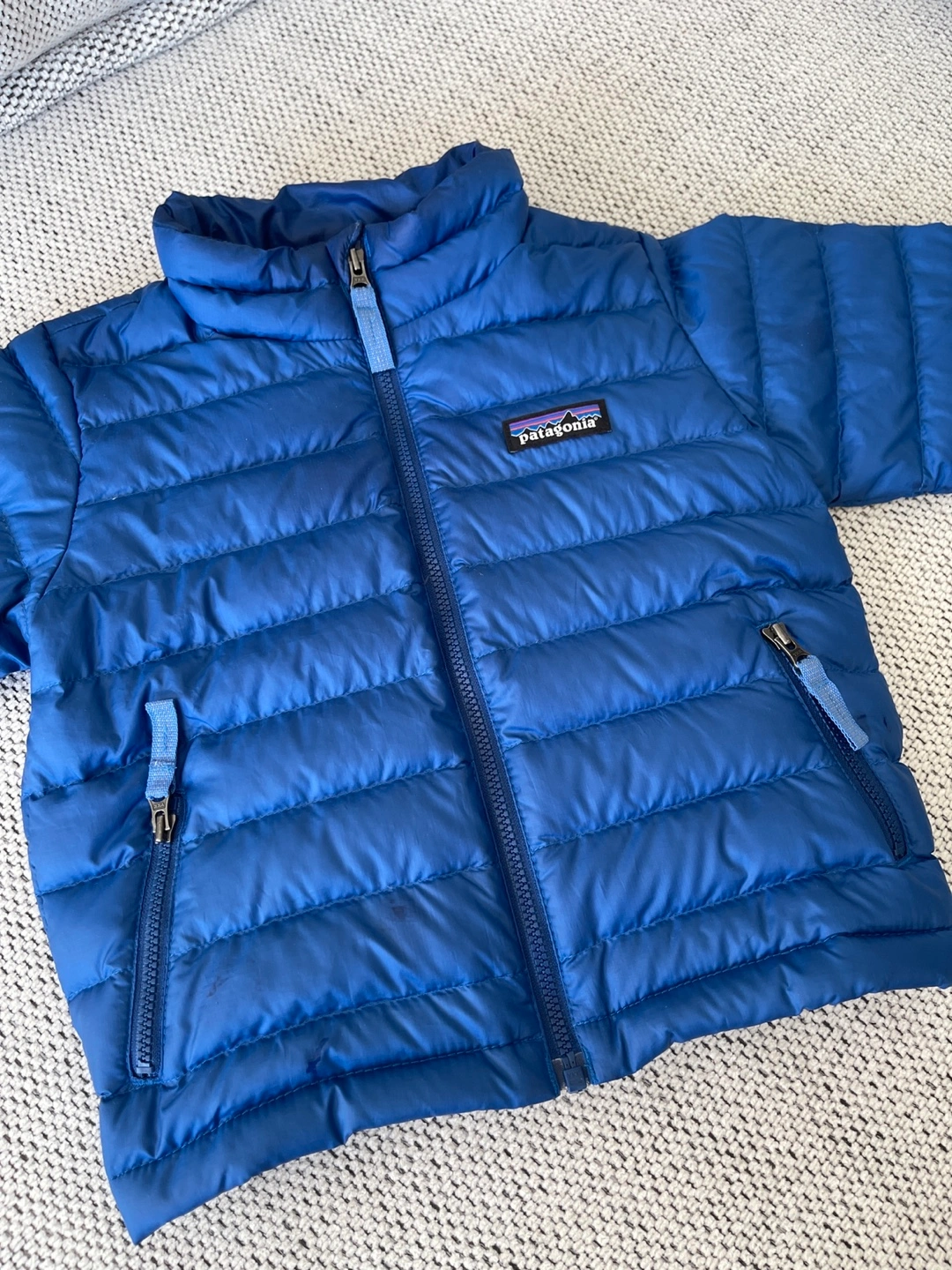Blue toddler Patagonia down jacket. Size 2T. Zipper closure. Two zippered pockets. Some minor marks.