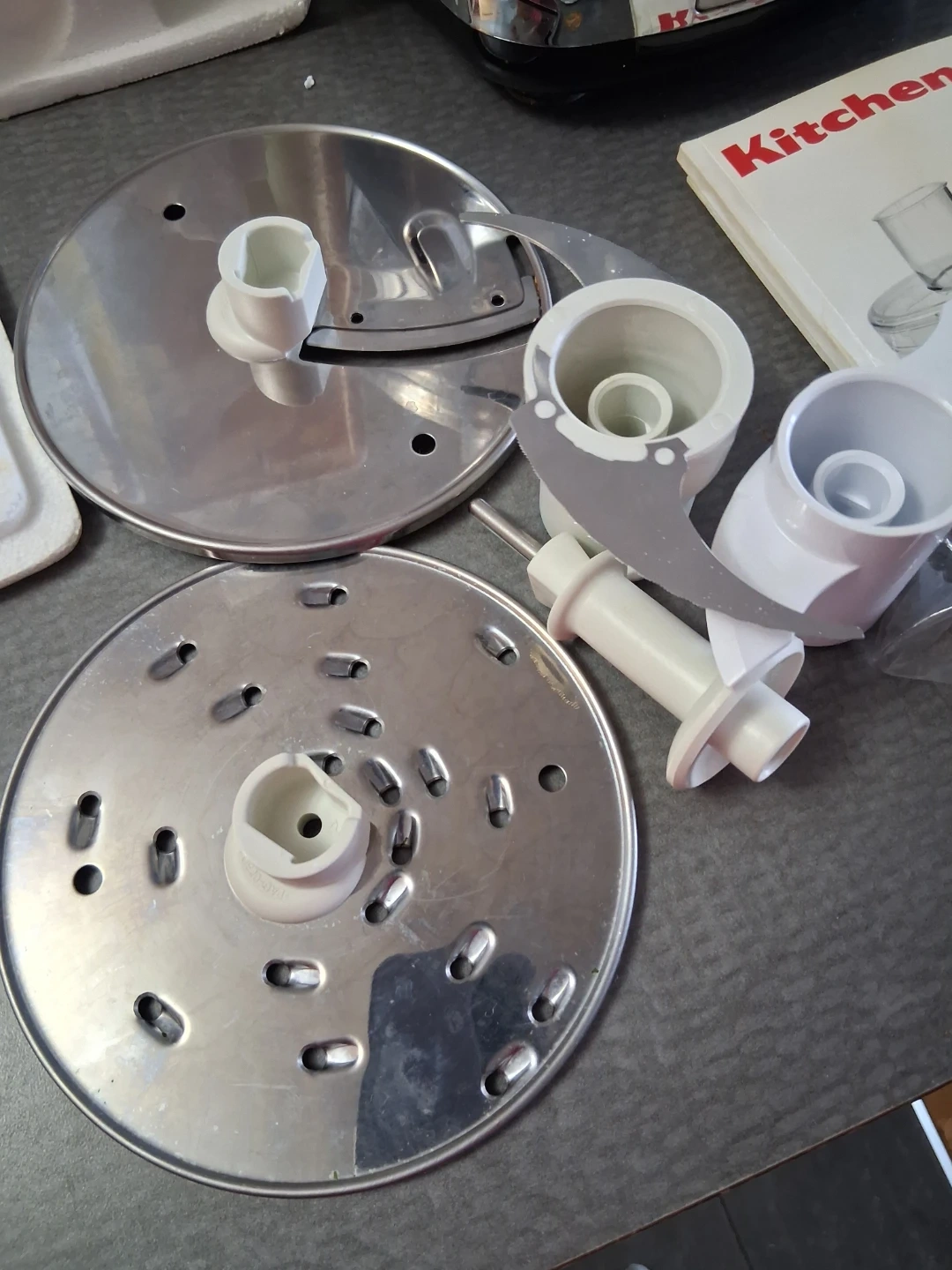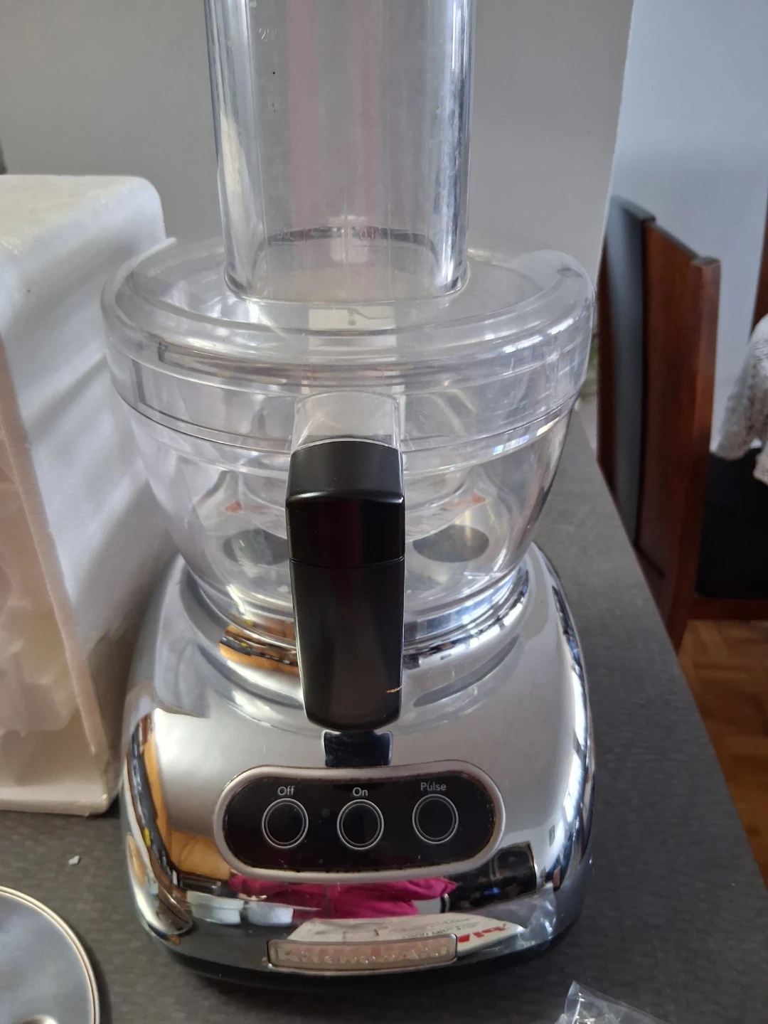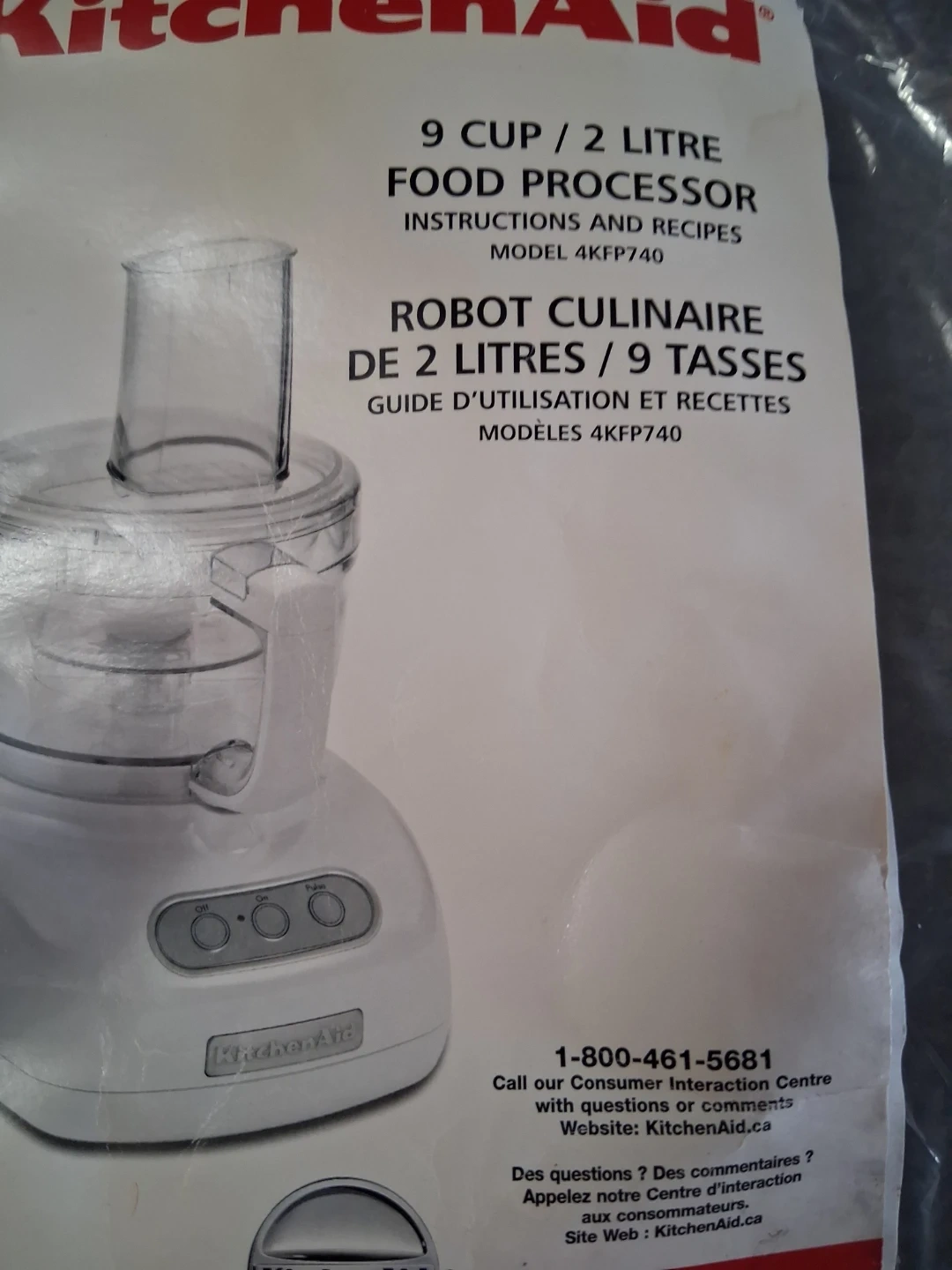 KitchenAid 9 cup food processor, model 4KFP740. It has a 2 litre capacity. Includes all blades and instructions.