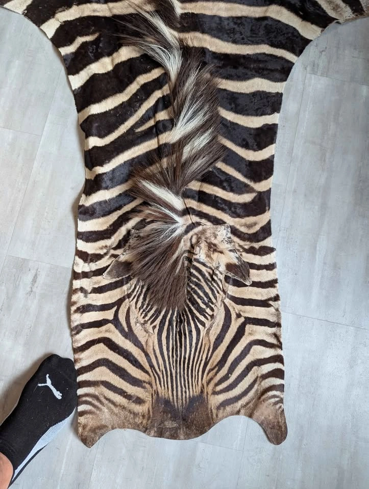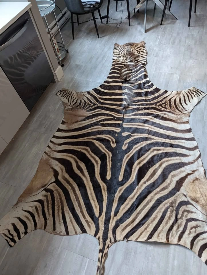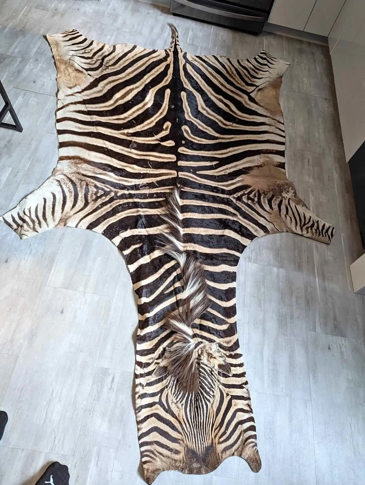 This zebra skin was taken from a humanly euthanized zebra on a preserve to sell to help with costs of running an paying the workers.