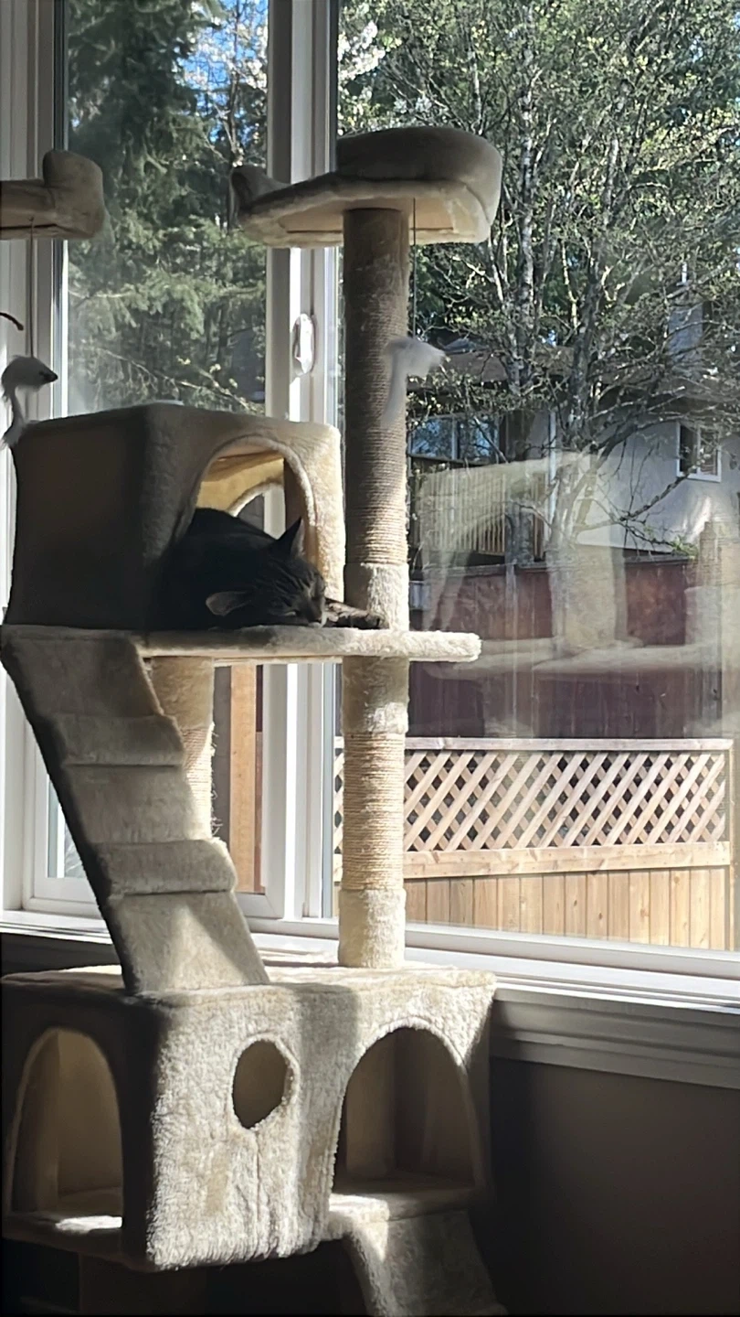 This cat tree condo offers multiple levels for your feline friends to climb and play. It features scratching posts wrapped in rope and soft carpeted platforms. It includes dangling toys to keep your cats entertained! This is a fun and engaging activity centre for cats.