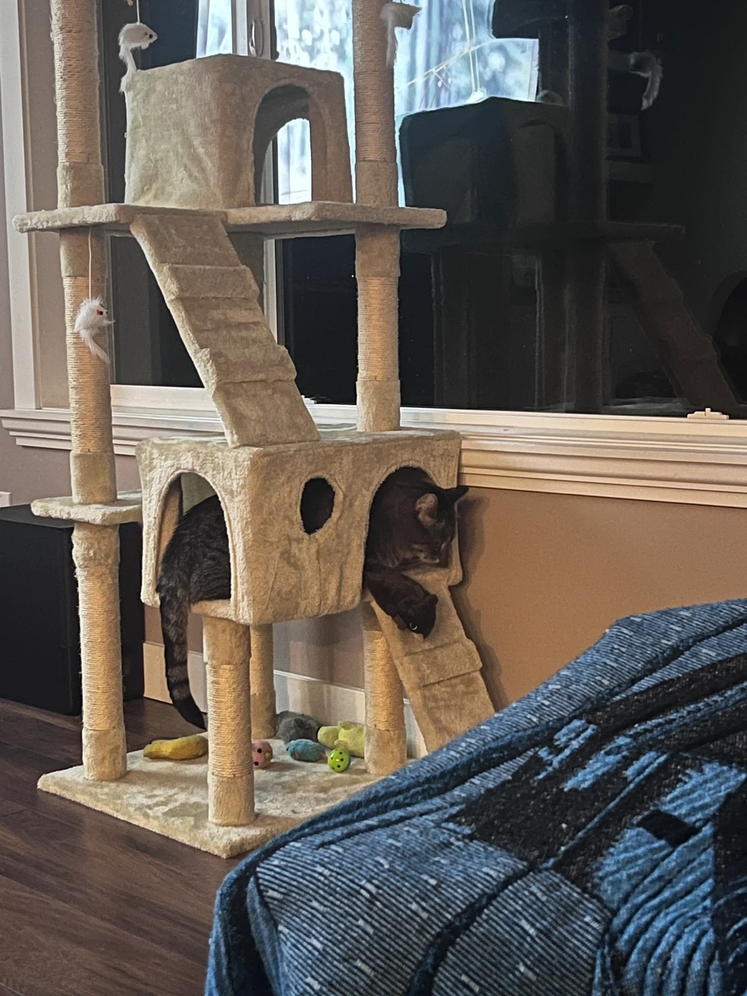 This cat tree condo offers multiple levels for your feline friends to climb and play. It features scratching posts wrapped in rope and soft carpeted platforms. It includes dangling toys to keep your cats entertained! This is a fun and engaging activity centre for cats.