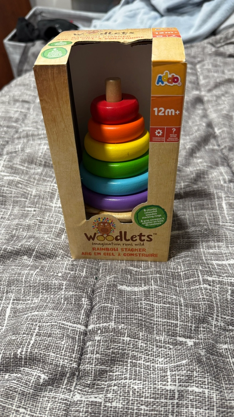 New in box. Wooden stacking toy. Six chunky colourful rings. Suitable for 12 months and older.