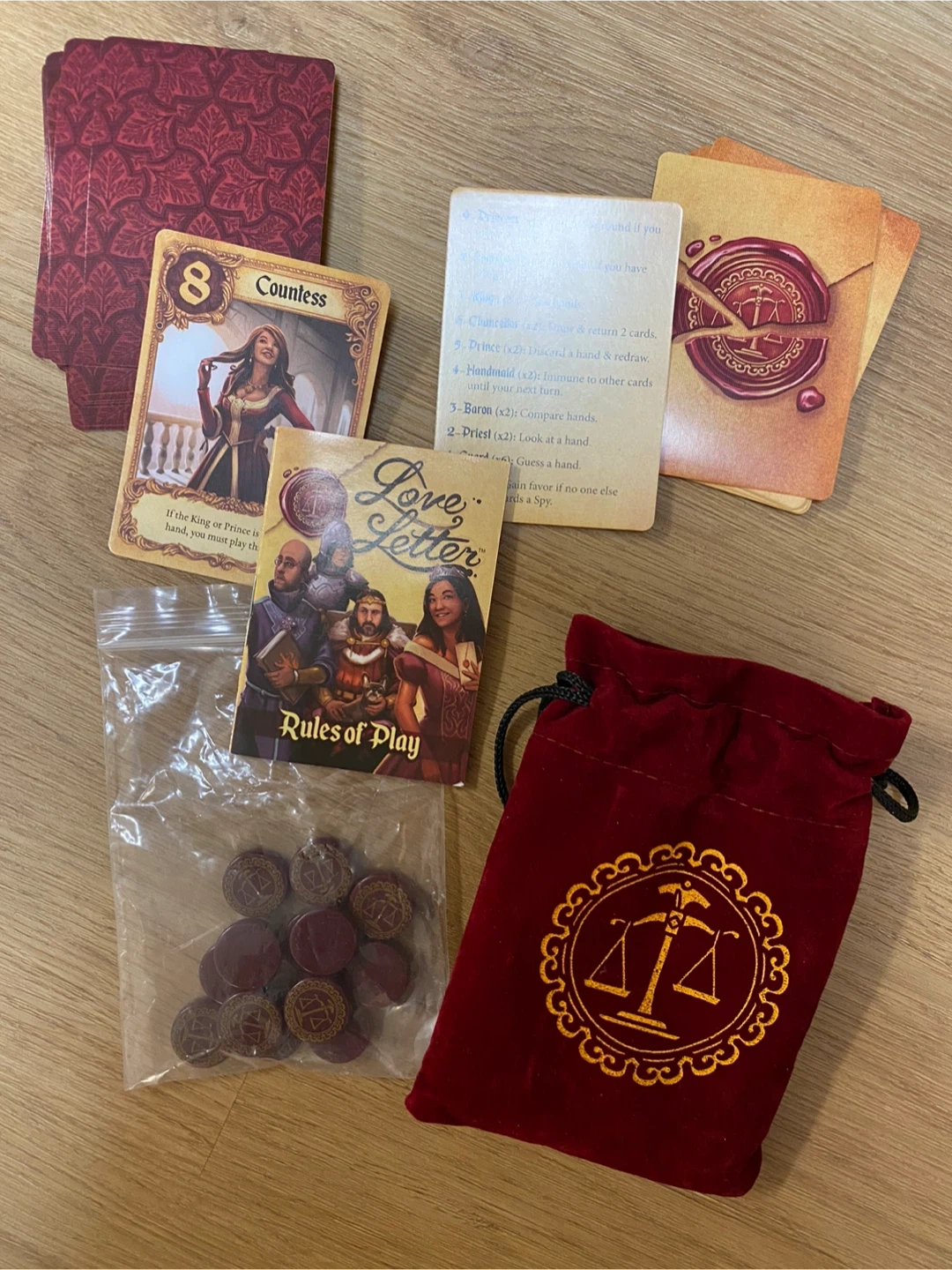This is the Love Letter card game. It comes with a deck of cards and tokens. Includes rules of play and a velvet drawstring bag for storage.